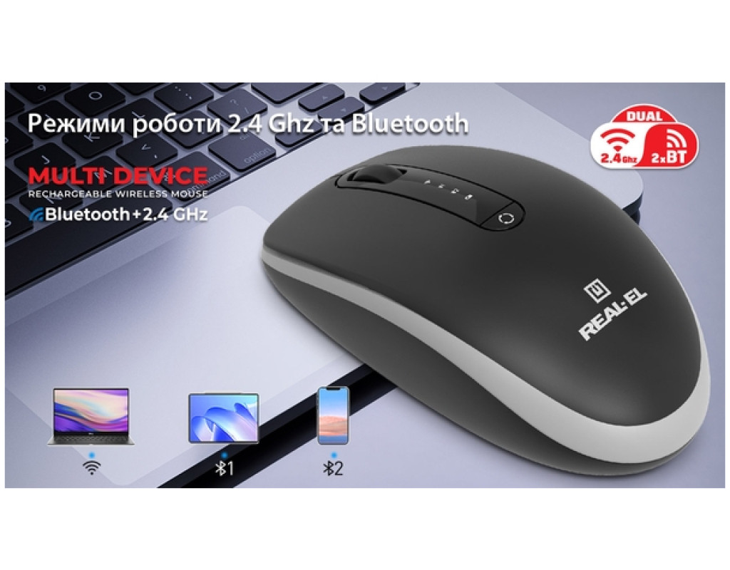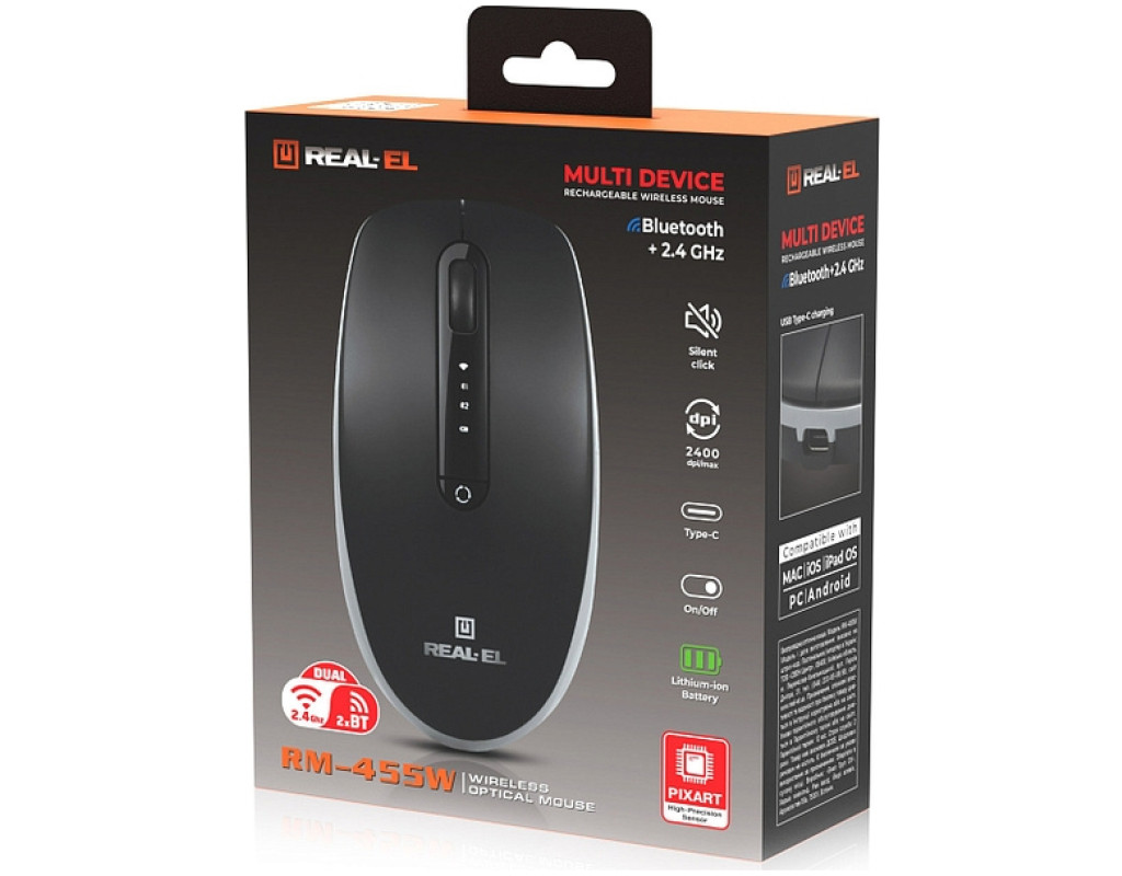 | Мишка REAL-EL RM-455W Wireless/Bluetooth Black/Gray (EL123200047) є втіленням сучасної ергономіки та інновацій, пропонуючи весь спектр необхідних функцій для комфортної та продуктивної роботи. Цей стильний аксесуар гармонійно поєднує якість та технологічні досягнення в одному пристрої, стаючи незамінним помічником як в офісі, так і вдома. Особливістю мишки є безшумні клавіші, які забезпечать спокійну роботу навіть у найбільш чутливих до шуму місцях. Ваша зосередженість залишиться непохитною, а оточуючі не будуть відволікатися, що робить REAL-EL RM-455W ідеальним вибором для будь-якого середовища. Ця мишка підтримує інноваційне бездротове підключення за допомогою Bluetooth та 2.4 ГГц USB адаптера, дозволяючи вільно перемикатися між різними пристроями без зусиль і без зайвих проводів. Це гарантує стабільне та надійне з'єднання, яке не підведе в будь-яких умовах. Мишка оснащена високоточним оптичним датчиком з регульованою роздільною здатністю від 800 до 2400 dpi, що дозволяє налаштувати швидкість і чутливість курсору згідно ваших потреб. Незалежно від того, чи редагуєте ви документи, чи захоплюєтеся динамічними іграми, ви завжди будете контролювати ситуацію. Відмітна риса REAL-EL RM-455W - це живлення від вбудованого акумулятора, що забезпечує тривалу автономну роботу. Зарядка виконується через сучасний порт USB Type-C, що надає змогу швидко відновити енергію. Це робить мишку відмінним супутником у динамічному робочому середовищі, адже вам більше не треба переривати робочий процес для заміни батарейок. Завдяки компактним розмірам 113 х 62 х 42 мм та легкій вазі у 68 г, мишку зручно носити з собою, а її чорний та сірий дизайн додасть стилю вашому робочому простору. REAL-EL RM-455W - це бездоганна комбінація стилю, надійності та функціональності. Обираючи мишку REAL-EL RM-455W, ви отримуєте більше ніж просто аксесуар. Це унікальний пристрій з передовими функціями, які націлені на те, щоб покращити ваші робочі звички та зробити день більш продуктивним та комфортним. |