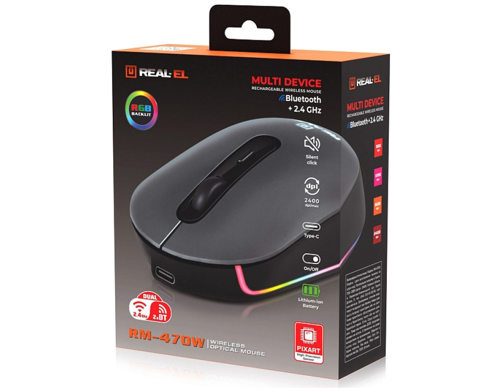 | Мишка REAL-EL RM-470W Wireless/Bluetooth Dark Gray (EL123200049) — це інноваційний пристрій, що об'єднує передові технології та елегантний дизайн для справжнього цифрового досвіду. Створена для тих, хто прагне зручності та функціональності під час роботи за комп'ютером, ця мишка ідеально підходить для ноутбуків, забезпечуючи чіткий контроль та комфорт у кожному русі завдяки своїм безшумним клавішам. Однією з ключових особливостей REAL-EL RM-470W є її здатність до бездротового підключення. Мишка може використовувати як інтерфейс Bluetooth, так і USB-адаптер на частоті 2.4 ГГц для з'єднання, що надає максимальну гнучкість під час підключення до будь-якого пристрою, будь це ноутбук, настільний комп'ютер або планшет. Така мультиплатформеність дає змогу використовувати мишку з різними операційними системами, такими як Windows, Mac, Android та iOS. Вбудований оптичний сенсор із регульованою роздільною здатністю до 2400 dpi забезпечує високу точність і плавність управління на різноманітних поверхнях. Це робить мишку ідеальним вибором для детальної роботи з графікою чи для отримання насолоди від захоплюючих ігор. З ергономічним дизайном та прогумованим колесом прокручування мишка гарантує комфорт навіть під час тривалого використання, забезпечуючи максимальну продуктивність. REAL-EL RM-470W оснащена акумулятором, який забезпечує тривалий час автономної роботи, знижуючи необхідність у частій заміні батарей. Це не тільки полегшує ваш робочий процес, але й є економічно вигідним рішенням. Вам більше не доведеться турбуватися про стан батареї під час важливої роботи чи запального ігрового марафону. Стильна підсвітка додає мишці оригінального вигляду, сприяючи створенню приємної атмосфери під час роботи чи відпочинку. Якщо виникне потреба, підсвітку легко можна вимкнути, орієнтуючись на ваші персональні налаштування комфорту. Завдяки своїм компактним розмірам (109 × 65 × 38 мм) та легкій вазі (70 г), мишка зручна для транспортування і чудово підходить для активного життя. Оберіть REAL-EL RM-470W, щоб отримати новий рівень якості, зручності та продуктивності, які відкриють вам необмежені можливості як у роботі, так і в іграх. Це сучасне рішення для кожного, хто цінує комфорт і функціональність у кожному елементі свого цифрового оточення. |