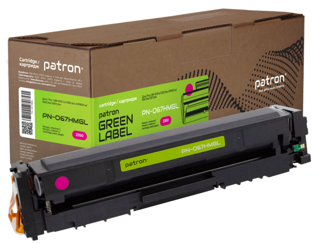 | Картридж сумісний Canon 067H жовтий Green Label Patron (PN-067HYGL) оптимальне рішення для лазерних принтерів та БФП. Основні властивості Детальна інформація: Що таке сумісний картридж? Кожен користувач друкувальної техніки стикається з питанням купівлі нового картриджа і знаходить досить велику кількість пропозицій. Як зробити правильний вибір? Розглянемо основні варіанти: Виробники друкувальних пристроїв (т.з. OEM виробники) наполягають на використанні оригінальних картриджів. Їх основний недолік - висока вартість. Сумісні картриджі виробляються різними компаніями - сторонніми виробниками. Вони дають можливість істотно заощадити на друці, проте питання оптимального балансу між якістю друку, ціною, гарантією та ресурсом картриджа залишається вибором Покупця. Картридж сумісний Canon 067H жовтий Green Label Patron (PN-067HYGL) гарантія Ми гарантуємо 12 місяців справної роботи картриджа та проведемо заміну продукції з виробничим дефектом. Якість друку Картриджі серії Patron Green Label виготовляються з використанням нових корпусів та повністю придатні для повторної заправки. Основна відміна серії Patron Green Label від картриджів низького цінового сегменту – якість комплектуючих, що забезпечує високу оптичну щільність друку, а також ресурс, аналогічний оригінальному картриджу. При виробництві картриджів Patron Green Label виробник дотримується загального стандарту ISO 9001:2015 і спеціальні стандарти, що використовуються в індустрії друку - ISO 19752:2017 для монохромних картриджів ISO 19798:2017 - для кольорових картриджів, а також STMC стандарт для контролю ресурсу. Захист навколишнього середовища Виробництво картриджів Patron Green Label відбувається з виконанням вимог міжнародного стандарту по захисту навколишнього середовища - ISO 14001:2015. Залишки матеріалів і комплектуючих, що використовуються для виробництва картриджів Patron Green Label, передаються на утилізацію відповідно Закону України "Про відходи". Для виробництва картонної упаковки ми використовуємо перероблені матеріали з нанесенням мінімальної кількості фарби. А конструкція коробки для картриджа дозволяє кілька разів відкривати і закривати його на "замок" для транспортування в сервісний центр. Ми закликаємо до нанесення мінімального впливу на довкілля. Тому заправляйте і відновлюйте картриджі Patron Green Label. Картридж сумісний Canon 067H жовтий Green Label Patron (PN-067HYGL) економія на офісному друці Вартість картриджів серії Patron Green Label в середньому на 70-80% нижче оригінальних витратних матеріалів. Оптимальне співвідношення ціна-якість робить дану продукцію хорошим вибором для Клієнтів, що бажають заощадити на друці і не прогадати з якістю. Зовнішній вигляд Ми потурбувалися про те, щоб упаковка картриджа була не лише екологічною, функціональною, мала мінімально можливі фізичні розміри, але і містила усю необхідну інформацію. На зеленій етикетці знаходиться інформація про картридж, його сумісність з друкувальними пристроями, номер партії, дата виготовлення, контакти виробника, а також номер телефону безкоштовної гарячої лінії для українських споживачів. Сподіваємось, що наведена інформація дозволить Вам зробити правильний вибір. Ваш друк – наша турбота! Оптимальний варіант для користувача, що хоче заощадити;При виробництві картриджа використовується новий корпус;Гарантований ресурс;Економія 70-80% у порівнянні з оригінальними витратними матеріалами;