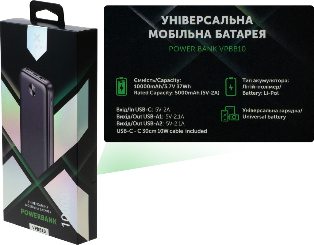 | Універсальна батарея Vinga 10000 mAh 10W Black (VPBB10) — ідеальний вибір для тих, хто цінує мобільність і надійність у будь-якій ситуації. З величезною ємністю 10000 mAh, цей портативний зарядний пристрій стане вашим незамінним супутником, забезпечуючи енергією улюблені гаджети протягом усього дня. Незалежно від того, чи потрібна енергія вашому телефону, планшету, роутеру, плеєру чи смарт-годиннику, ця батарея впорається з будь-яким завданням. Оснащена Lі-pol електрохімічною системою, батарея гарантує стабільне та безпечне постачання енергії. Завдяки надійному захисту від короткого замикання та перегріву, ваші пристрої залишаться у безпеці. Інтерфейси підключення вражають різноманітністю: два входи — USB Type-C та USB, а також виходи — 2 х USB та 2 x USB Type-C забезпечують швидке та зручне заряджання кількох пристроїв одночасно. Корпус із високоякісного термопластику витримує різні умови експлуатації, зберігаючи при цьому елегантний вигляд. Сучасний дизайн у стриманому чорному кольорі легко впишеться в будь-який стиль, роблячи пристрій не тільки функціональним, але й стильним аксесуаром. Окрім цього, універсальна батарея Vinga підтримує зарядку через USB, що робить її максимально сумісною з більшістю наявних на ринку пристроїв. Потужність у 10 Вт забезпечує швидке заповнення енергії, тож вам не доведеться чекати. Незалежно від того, чи ви подорожуєте, чи проводите час у міській метушні, Vinga 10000 mAh 10W Black гарантовано стане вашим надійним партнером. Оберіть якість та зручність, зупинивши свій вибір на цій портативній батареї, і ви завжди залишатиметеся на зв’язку з усім світом. |