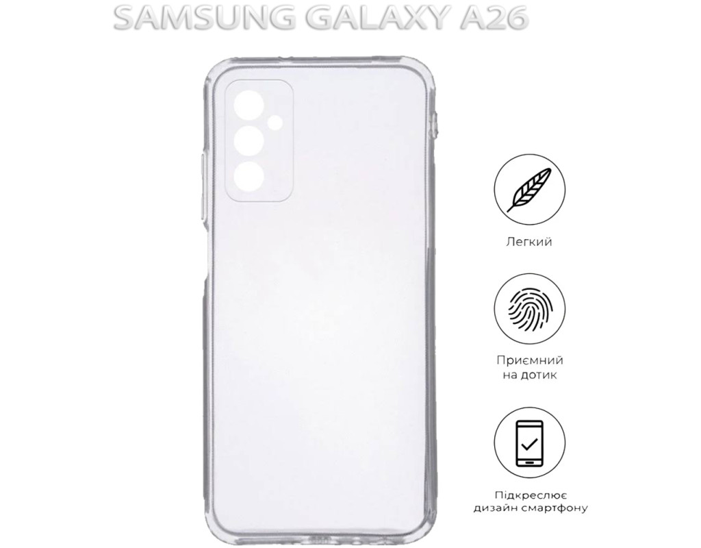 сумісність з моделями - Samsung Galaxy A26, Тип чохла для телефону - накладка, Призначення - модельний, Матеріал - силікон, Колір - прозорий