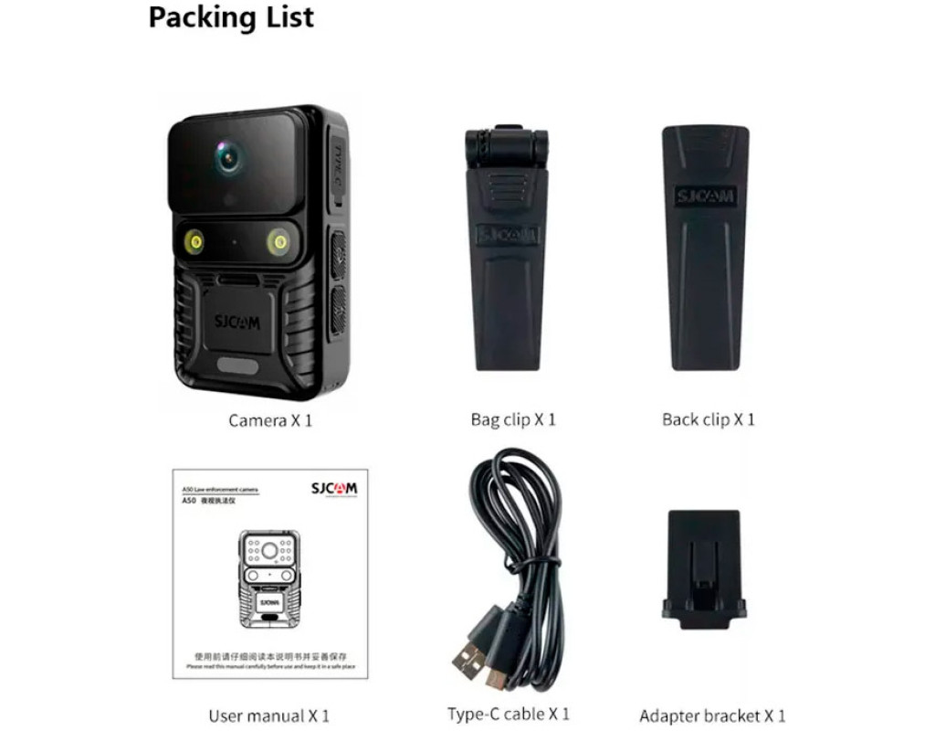 SJCAM A50 - екшн-камера, яка підходить для використання в різних сценаріях. Вона є чудовим варіантом нагрудної камери для поліцейських та охоронців. Вона також може бути встановлена на додаткове кріплення в салон автомобіля в якості дорожнього реєстратора. Сенсорний 2-дюймовий екран миттєво реагує на доторки пальців та робить зручними усі налаштування. Корпус екшн-камери SJCAM A50 захищений від негативного впливу вологи та пилу. Із рівнем захисту IP65 ви без проблем зможете проводити запис за будь-яких погодних умов. Камера підтримує роздільну здатність 4K при частоті 30 кадрів за секунду. Кут огляду 135° дозволяє охопити зйомкою велику територію. Високоякісний інфрачервоний сенсор дає можливість робити чорно-білі фотографії в темряві – фіксуйте важливі докази у нічний час. Екшн-камера також оснащена двома світлодіодними лампами, які забезпечують якісне освітлення у темний час доби. Вмикайте функцію GPS у налаштуваннях та отримуйте більше інформації про місце запису ваших відео. Роз’єм USB Type-C дозволяє здійснювати обмін даними з сумісними пристроями з високою швидкістю. Встановлюйте Wi-Fi з’єднання та не витрачайте часу на дротові підключення. Керуйте камерою через пульт дистанційного керування. Одягайте його на руку й проводьте запис, фотографування, регулювання кута, відтворення або призупинення відео на відстані від камери. Автономна робота камери SJCAM A50 забезпечується знімним акумулятором ємністю 2250 мАг, одного заряду якого вистачає до 7,5 годин запису. |