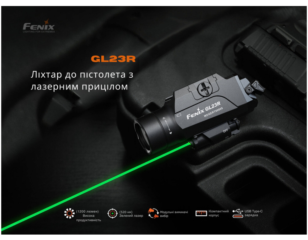 | Ліхтар Fenix GL23R з лазерним прицілом (GL23R) — це універсальний та надійний інструмент, створений для професіоналів і аматорів, які цінують якість та функціональність. Цей підствольний ліхтар спеціально розроблений для підвищення точності та ефективності при виконанні службових або тактичних завдань. Завдяки компактним розмірам всього 87 мм і вазі лише 120 г, він легко встановлюється на більшість повнорозмірних пістолетів з планками Glock або Mil-std-1913 (Пікатінні), що значно розширює можливості його використання. Серцем Fenix GL23R є LED-джерело Luminus SFT40, яке генерує надзвичайно яскравий холодний білий промінь потужністю 1200 люмен. Він здатний освітлювати на відстань до 240 метрів, що робить цей ліхтар ідеальним рішенням для роботи в умовах обмеженої видимості або вночі. Зелений лазер, з хвилею 520 нм, надає точний цілевказівник, поліпшуючи точність стрільби. Перехід між режимами, такими як біле світло, зелений лазер або комбінований режим, здійснюється швидко і зручно за допомогою нижнього обертового перемикача та перемикачів в задній частині корпусу. Функціональність ліхтаря підтримується вбудованим акумулятором ємністю 1100 мАг, який гарантує стабільну роботу пристрою на тривалий час. Зарядка здійснюється через USB Type-C порт, що забезпечує швидкість та зручність в процесі відновлення заряду. Порт захищає резинова заглушка, що оберігає від вологи та пилу. Додаткову зручність забезпечує індикатор заряду, що змінює колір з червоного на зелений після повного заряджання. Матеріал корпуса — це міцний алюміній A6061-T6 з анодуванням типу III, який захистить ліхтар від фізичних пошкоджень при падінні з висоти до 1 метра. Вологонепроникність та захист від пилу класу IP66 гарантує надійну роботу під дощем та в умовах високої вологості. Ліхтар постачається з комплектом з чотирьох змінних перемикачів, які дозволяють налаштувати керування відповідно до ваших потреб, та ущільнювальним кільцем для додаткового захисту. Крім того, конструкція передбачає ключ та кріплення на планку Glock, які розширюють можливості встановлення та використання. Режими роботи ліхтаря наступні: - Білий: 1200 лм – 1 година – 240 м; - Зелений лазер: 520 нм; - Комбінований режим (біле світло + зелений лазер): 1200 лм + 520 нм – 1 година – 240 м. Цей ліхтар є втіленням бездоганної якості та інноваційних технологій, що гарантують відмінну продуктивність у будь-якій ситуації. Якщо вам потрібна надійність, висока яскравість та лазерна точність в одному пристрої, Fenix GL23R — ваш ідеальний вибір. |