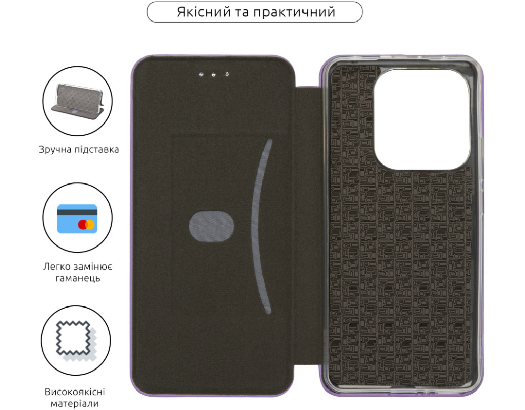сумісність з моделями - Xiaomi Redmi Note 14 5G, Тип чохла для телефону - книжка, Призначення - модельний, Матеріал - штучна шкіра, Колір - бузковий
