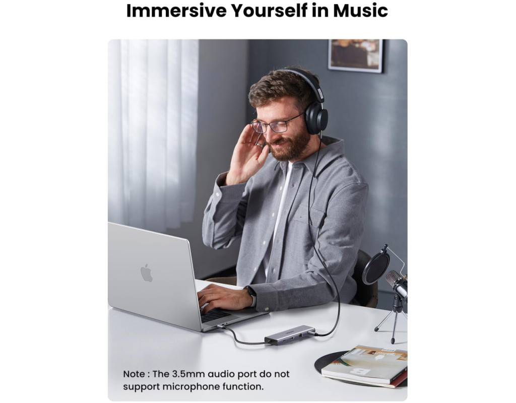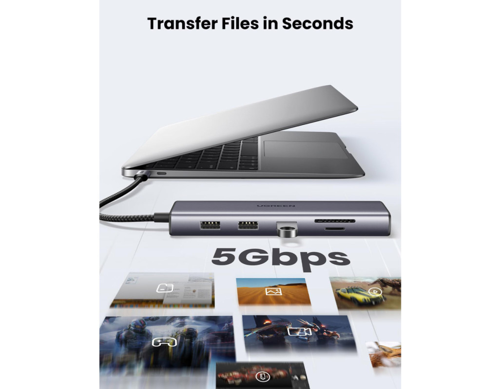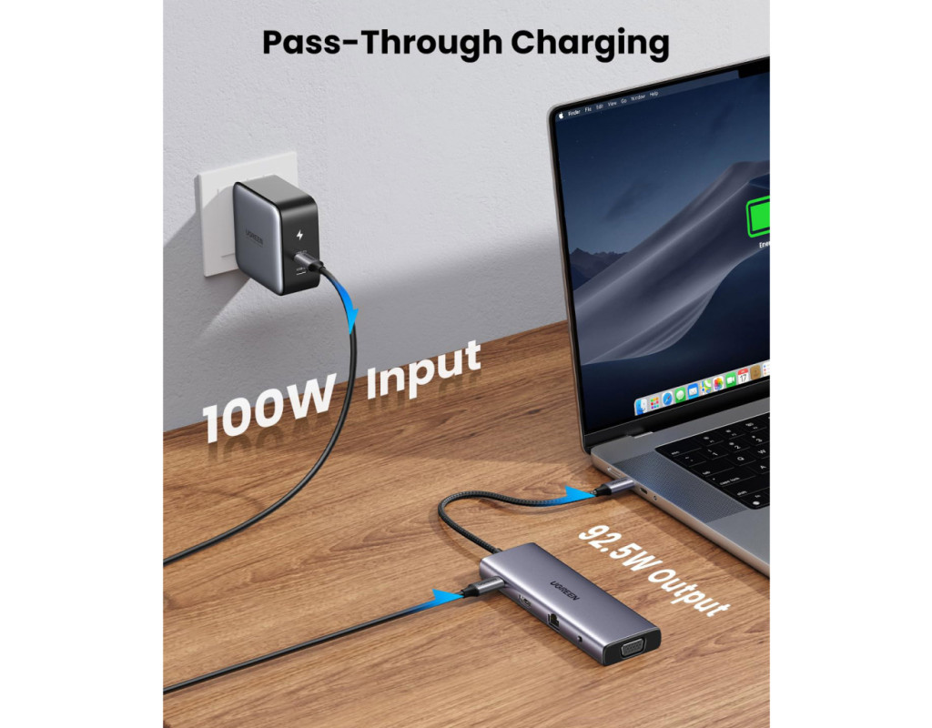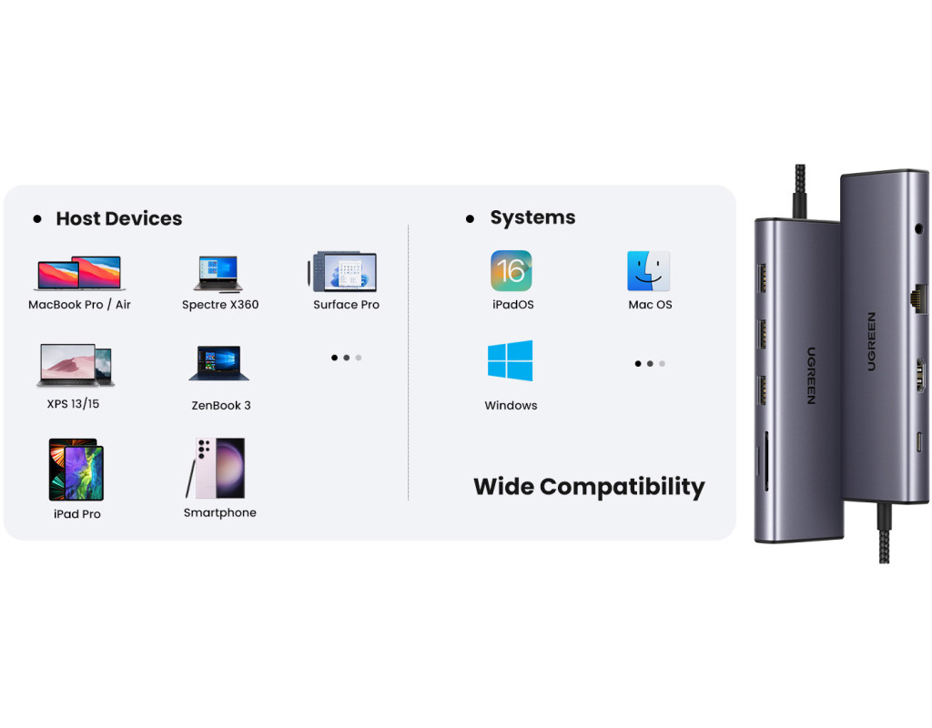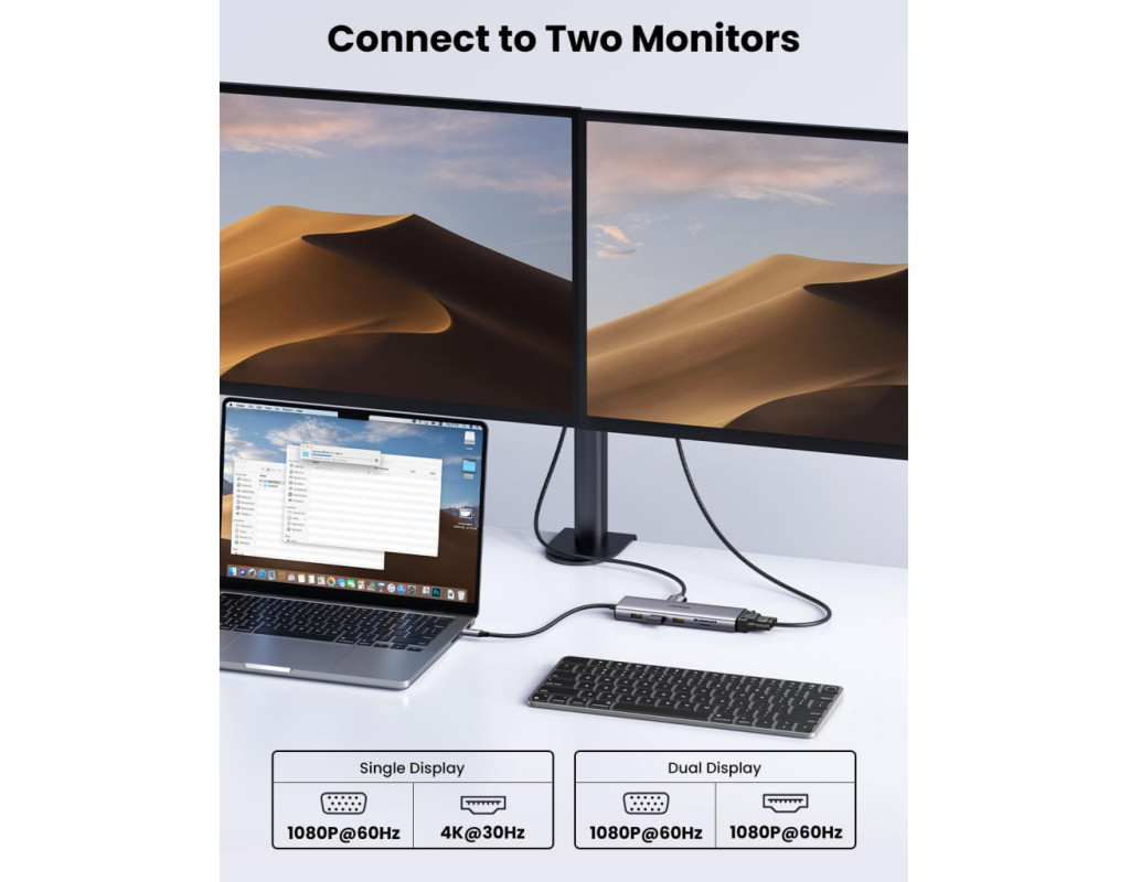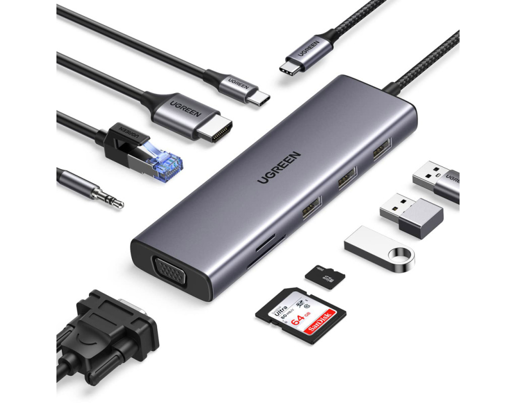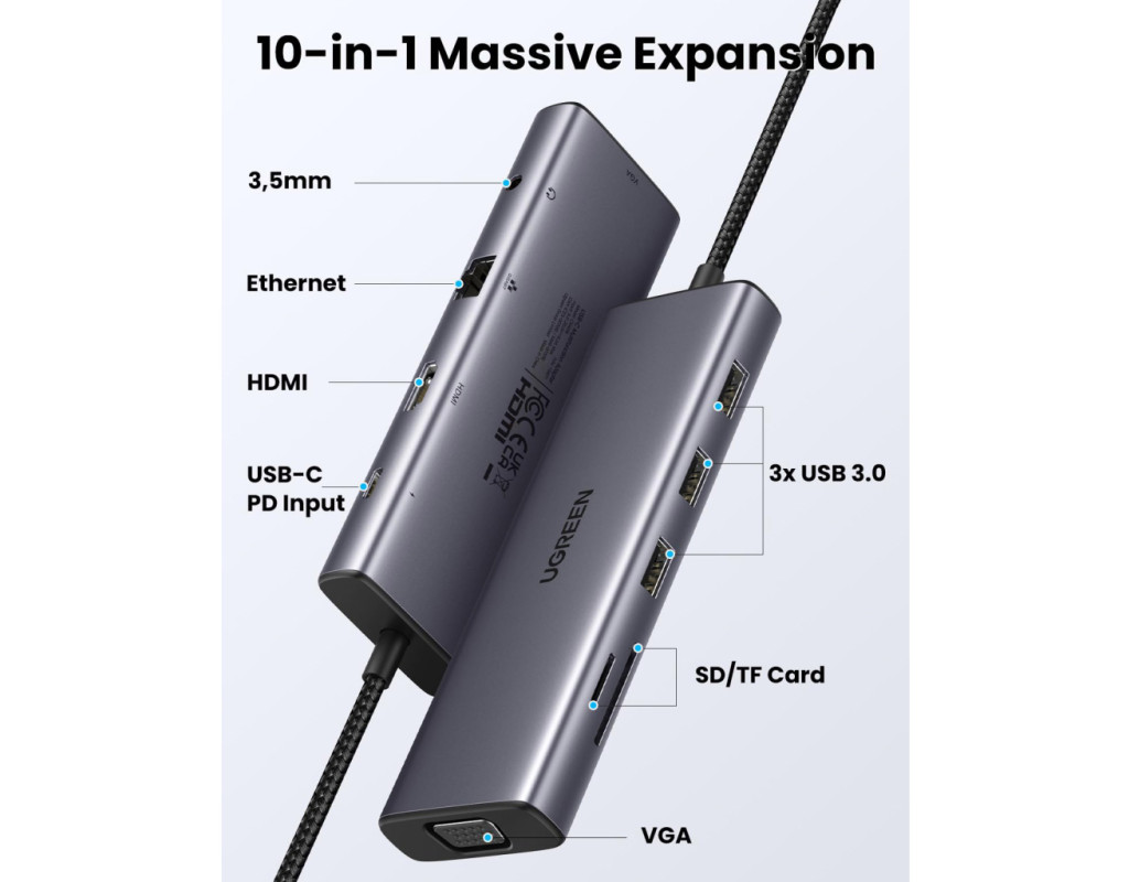 Хаб Ugreen 10 в 1 USB C забезпечує розширений подвійний монітор 4K HDMI і 1080P VGA, порт Gigabit Ethernet, порт зарядки USB C 100 Вт PD, 3 порти USB A 3.0, аудіороз'єм 3.5 мм і пристрій читання карт SD TF. Усі порти багатопортового адаптера можна використовувати одночасно.