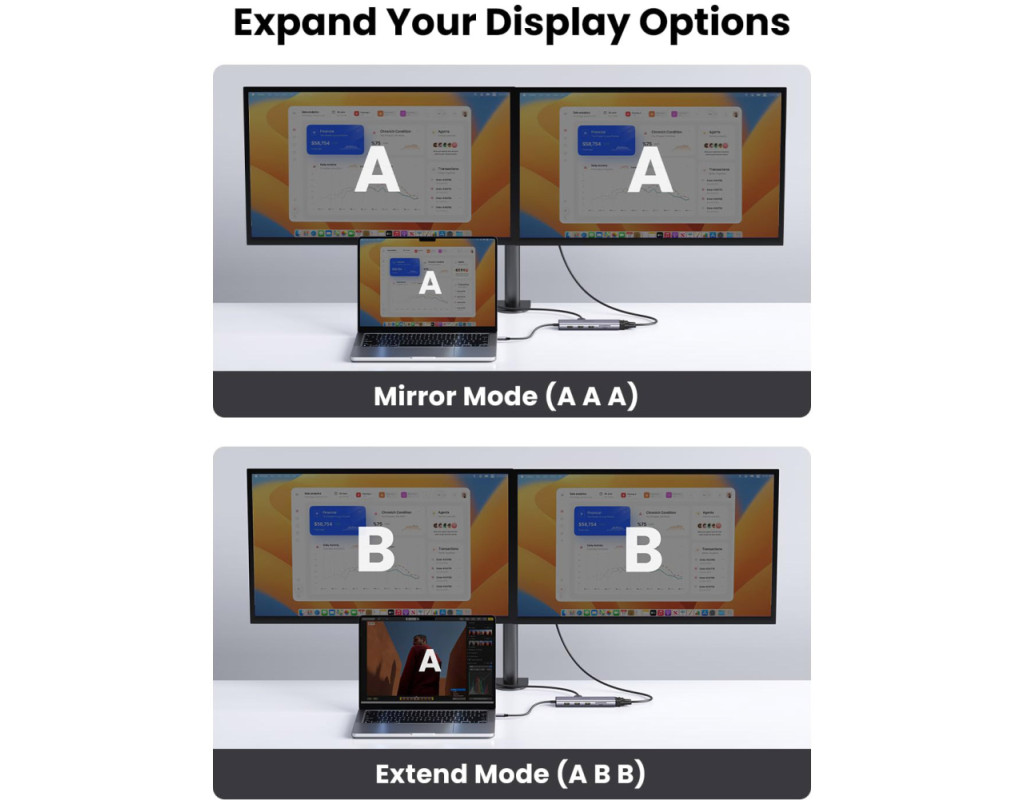 Подвійний монітор, розширений Порти 4K HDMI і 1080P VGA можна одночасно використовувати для різних пристроїв відображення, як-от монітор, телевізор, проєктор. Максимальна вихідна роздільна здатність досягає 4K 30 Гц через HDMI і 1080P 60 Гц через VGA. Дзеркальний режим AAA і розширений режим ABB підтримуються як на Mac, так і на Windows.