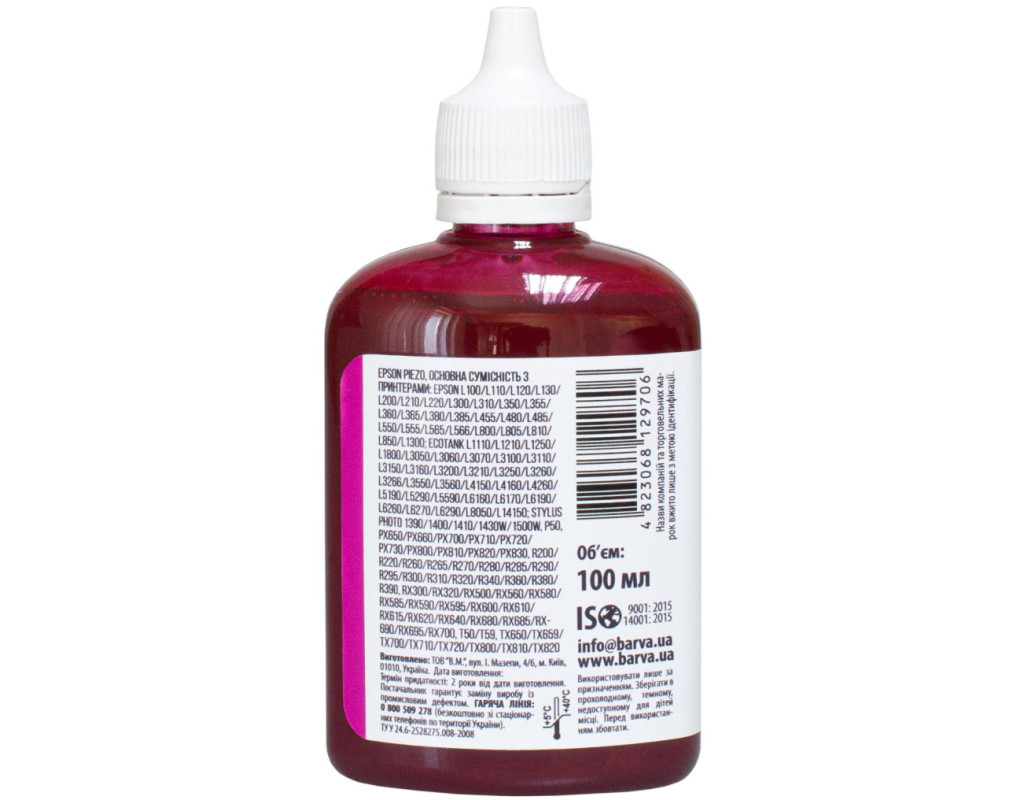 | Сублімаційні чорнила – спеціальний тип чорнил, що використовується для перенесення зображень на текстиль, метал, кераміку, пластик і т.д. Чорнило сумісне для настільних принтерів Epson 100 мл, сублімаційне, пурпурове Barva (SUB-914) використовується для заправки настільних принтерів Epson. Чорнила SUB-914 Barva мають офіційну гарантію – АТ000953. При виборі чорнила Вам також необхідно звернути увагу на колір картриджа, який плануєте заправляти. Ці чорнила Barva мають колір – magenta (пурпурний). Виробник гарантує безперебійну роботу чорнил протягом всього терміну використання, який складає – 2 роки. Тип чорнил SUB-914 Barva – Сублімаційні. Українська компанія ТОВ «В.М.» виготовляє чорнила під торговою маркою Barva вже багато років. На базі власної лабораторії відбувається як розробка нових формул, так і неперервний контроль якості продукції, що випускається. При виробництві чорнил виробник слідує стандартам ISO 9001:2015 та ISO 14001:2015. Для досягнення найкращого результату в передачі кольору та стійкості до світла ми рекомендуємо використовувати комбінацію – Спеціальний папір для сублімаційного друку Barva + чорнила Barva. Дана фарба для принтера Epson Barva має фасовку – 100 мл, що має наступні особливості: Чорнила для принтера Epson SUB-914 Barva 90 гр./100 мл розфасовані в спеціальні флакони для зручної заправки; Ретельно підібраний поліетиленовий флакон має зручну насадку-носик, яка дозволяє легко заправити картриджі чи резервуари принтера без шприца; Невеликий об’єм чорнил ідеально підходить для користувачів, які друкують небагато; Чистота при заправці завдяки зручному флакону; Заправка в резервуар принтера: Зніміть кришку з флакону, відкрийте заглушки на резервуари з чорнилами на пристрої; Переконайтеся, що немає помилки з кольором чорнил; За допомогою носика на флаконі перелийте чорнила в ємності пристрою. Чорнила SUB-914 Barva, поради щодо використання: Підготуйте майбутній малюнок для переносу у дзеркальному зображенні. Надрукуйте тестовий аркуш для перевірки, чи все правильно зроблено. Перенесіть підготовлене зображення на необхідну поверхню за допомогою термопресу. Якщо плануєте переносити зображення на текстиль, обирайте тканину із вмістом синтетики не менше 50%. Ви можете купити Чорнило сумісне для настільних принтерів Epson 100 мл, сублімаційне, пурпурове Barva (SUB-914) в нашому інтернет-магазині з доставкою по Києву та всій Україні. |