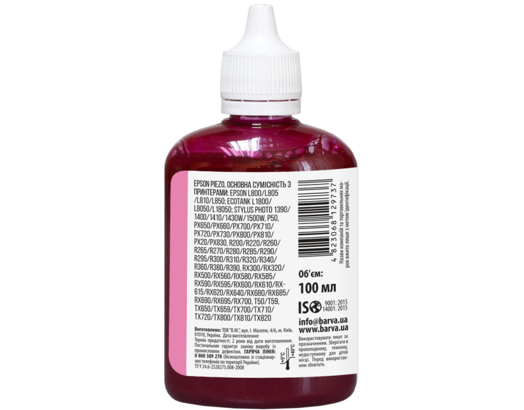 | Сублімаційні чорнила – спеціальний тип чорнил, що використовується для перенесення зображень на текстиль, метал, кераміку, пластик і т.д. Чорнило сумісне для настільних принтерів Epson 100 мл, сублімаційне, світло-пурпурове Barva (SUB-917) використовується для заправки настільних принтерів Epson. Чорнила SUB-917 Barva мають офіційну гарантію – АТ000953. При виборі чорнила Вам також необхідно звернути увагу на колір картриджа, який плануєте заправляти. Ці чорнила Barva мають колір – light magenta (світло пурпурний). Виробник гарантує безперебійну роботу чорнил протягом всього терміну використання, який складає – 2 роки. Тип чорнил SUB-917 Barva – Сублімаційні. Українська компанія ТОВ «В.М.» виготовляє чорнила під торговою маркою Barva вже багато років. На базі власної лабораторії відбувається як розробка нових формул, так і неперервний контроль якості продукції, що випускається. При виробництві чорнил виробник слідує стандартам ISO 9001:2015 та ISO 14001:2015. Для досягнення найкращого результату в передачі кольору та стійкості до світла ми рекомендуємо використовувати комбінацію – Спеціальний папір для сублімаційного друку Barva + чорнила Barva. Дана фарба для принтера Epson Barva має фасовку – 100 мл, що має наступні особливості: Чорнила для принтера Epson SUB-917 Barva 90 гр./100 мл розфасовані в спеціальні флакони для зручної заправки; Ретельно підібраний поліетиленовий флакон має зручну насадку-носик, яка дозволяє легко заправити картриджі чи резервуари принтера без шприца; Невеликий об’єм чорнил ідеально підходить для користувачів, які друкують небагато; Чистота при заправці завдяки зручному флакону; Заправка в резервуар принтера: Зніміть кришку з флакону, відкрийте заглушки на резервуари з чорнилами на пристрої; Переконайтеся, що немає помилки з кольором чорнил; За допомогою носика на флаконі перелийте чорнила в ємності пристрою. Чорнила SUB-917 Barva, поради щодо використання: Підготуйте майбутній малюнок для переносу у дзеркальному зображенні. Надрукуйте тестовий аркуш для перевірки, чи все правильно зроблено. Перенесіть підготовлене зображення на необхідну поверхню за допомогою термопресу. Якщо плануєте переносити зображення на текстиль, обирайте тканину із вмістом синтетики не менше 50%. Ви можете купити Чорнило сумісне для настільних принтерів Epson 100 мл, сублімаційне, світло-пурпурове Barva (SUB-917) в нашому інтернет-магазині з доставкою по Києву та всій Україні. |