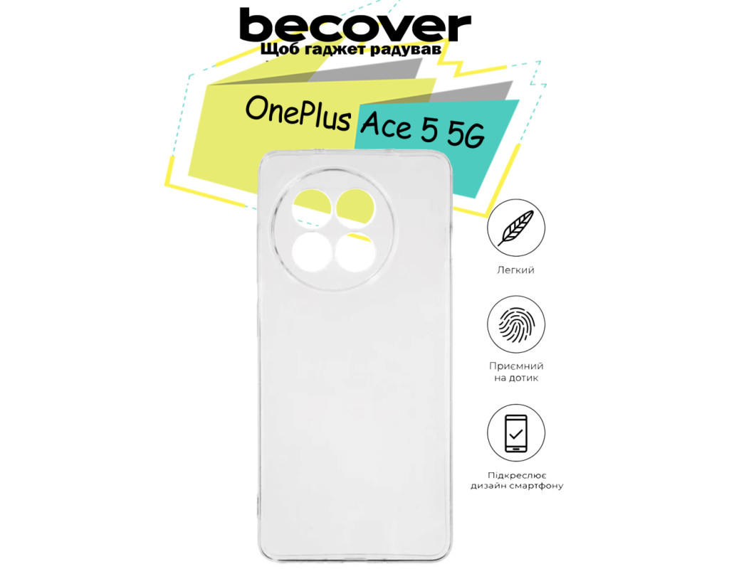 сумісність з моделями - OnePlus Ace 5 5G, Тип чохла для телефону - накладка, Призначення - модельний, Матеріал - силікон, Колір - прозорий