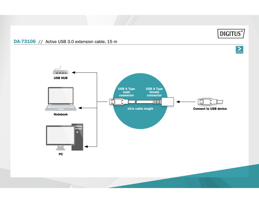 Підключайте пристрої USB 3.0, такі як принтери або сканери, до комп'ютера або ноутбука навіть на великих відстанях. Інтегрована електроніка завжди забезпечує плавну передачу даних без втрат. Із серією активних подовжувальних кабелів USB 3.0 DIGITUS пропонує рішення завдовжки від 10 до 20 м. |