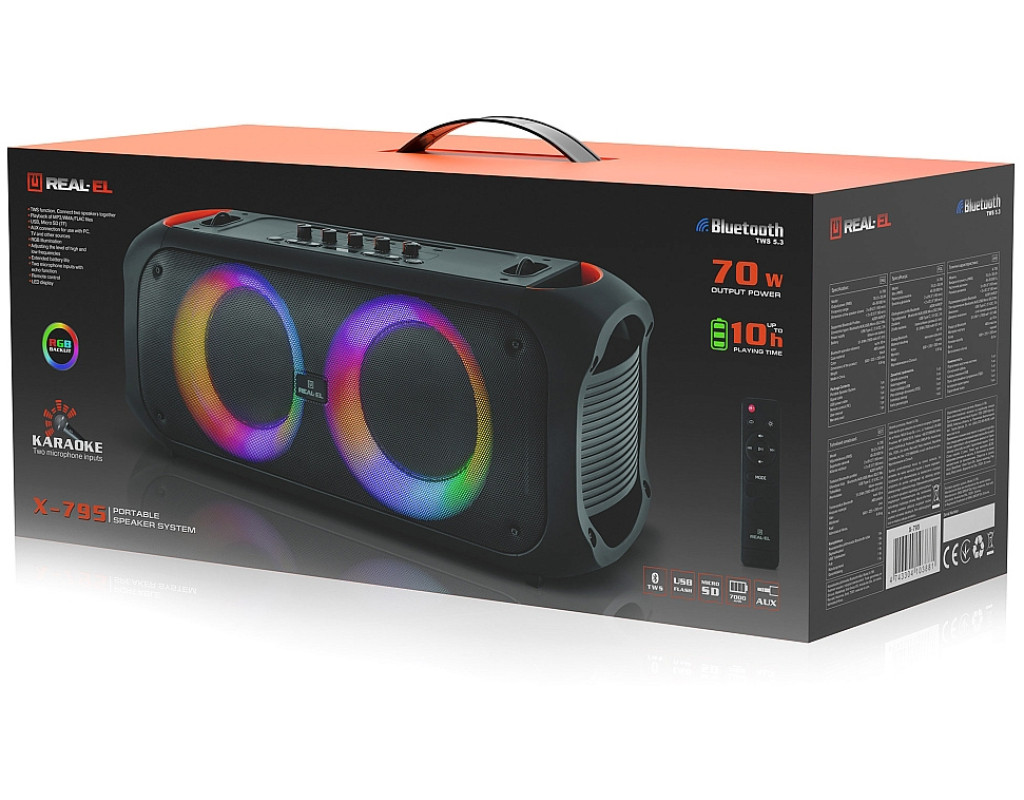 | Акустична система REAL-EL X-795 (EL121600022) — це яскравий зразок сучасних технологій, втілених у стильній портативній колонці, яка створена, щоб дарувати вам незабутні музичні моменти. Пориньте у світ якісного звучання з приголомшливою віддачею в 70 Вт, що разом із динаміками Ø 6.5" та твітерами Ø 3.5" забезпечує глибокі баси та яскраві високі частоти. Ваші улюблені треки зазвучать по-новому, наповнюючи простір енергією та емоціями. Ця портативна колонка пропонує безмежні можливості підключення: дротове через USB або AUX та бездротове через Bluetooth. Будьте завжди в ритмі, підключаючи смартфон, ПК, телевізор або інші пристрої. Для зручності користування передбачені слоти для Micro SD карт та USB-флешок, що дозволяють легко відтворювати музичні колекції. Спеціальна функція TWS (True Wireless Stereo) дає змогу об'єднати дві такі колонки в одну потужну бездротову стереосистему потужністю 140 Вт, створюючи невимушену атмосферу в будь-якому місці. Однією з ключових особливостей REAL-EL X-795 є RGB LED підсвічування, що перетворює кожну вечерю або вечірку в справжнє світлове шоу, підкреслюючи магію музики. Для любителів караоке або професійних виступів колонка обладнана двома мікрофонними входами з регулюванням гучності та ефектом ехо, що додає ваших вокальним здібностям ще більше виразності. Живлення від акумулятора забезпечує автономну роботу до 10 годин, що дозволяє насолоджуватися музикою навіть на віддалених локаціях без доступу до джерел енергії. Швидка і зручна зарядка здійснюється через USB Type-C порт. Для зручності управління передбачений інтуїтивно зрозумілий пульт дистанційного керування, що робить контроль над усіма функціями максимально простим і комфортним. Корпус колонок виконаний із легкого, але міцного пластику, що не тільки гарантує витривалість, але й полегшує транспортування — важить усього 6.6 кг. Незалежно від місця, де ви знаходитесь, ця акустична система стане вашим надійним супутником у створенні музичної атмосфери. REAL-EL X-795 — це універсальне рішення для тих, хто цінує якість звуку, стильний дизайн і функціональність. Вона стане ідеальним вибором для вечірок, відпочинку на природі або домашнього використання, перетворюючи звук у справжнє задоволення, а світлові ефекти — у візуальне диво, яке заряджає кожен момент енергією та радістю. |