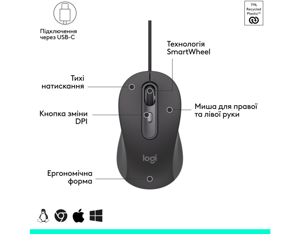 | Мишка Logitech Signature M520 for Business USB-C Graphite (910-007511) – ідеальний вибір для тих, хто цінує якість та продуктивність у щоденній роботі. Створена для бізнес-середовища, ця модель поєднує в собі ергономічний дизайн та новітні технологічні рішення, роблячи робочий процес легким і приємним. З класичним виглядом та розмірами 108 х 64 х 39 мм, мишка зручно лягає в руку, підходячи як для правої, так і лівої руки, завдяки симетричному дизайну. Підключення через USB Type-C забезпечує швидкість і надійність, виключаючи залежність від бездротових сигналів та потребу в зарядці акумуляторів, а довжина кабеля у 1.8 м забезпечує свободу руху без зайвих обмежень. Завдяки технології SilentTouch, мишка практично беззвучна при натисканні клавіш, що робить її незамінною у тихому офісному середовищі, де кожен звук має значення. В основі пристрою – оптичний датчик з роздільною здатністю до 1000 dpi, який дозволяє без зусиль контролювати швидкість і точність руху курсору, роблячи цю мишу ефективним інструментом для роботи з різними додатками та проектами. Окрема увага приділена колесику прокручування. Технологія SmartWheel дозволяє миттєво перемикатися між режимами точного та швидкого прокрутки, що стане в нагоді при обробці великих документів або серфінгу в Інтернеті. Logitech Signature M520 підтримує різноманітні операційні системи, такі як Windows, macOS, Linux, iPadOS і ChromeOS, що робить її універсальним рішенням для всіх видів роботи. Завдяки платформі Logi Options+, користувачі можуть налаштовувати функції клавіш під свої потреби, що підвищує ефективність і знижує рутинні зусилля. Ця модель виготовлена з екологічних матеріалів, в тому числі з переробленого пластику, що підкреслює відданість Logitech до збереження навколишнього середовища. Підсумовуючи, мишка Logitech Signature M520 for Business USB-C Graphite – це надійний, сучасний та екологічний інструмент, який об'єднує комфорт, технології і ефективність для вашої продуктивної роботи. |