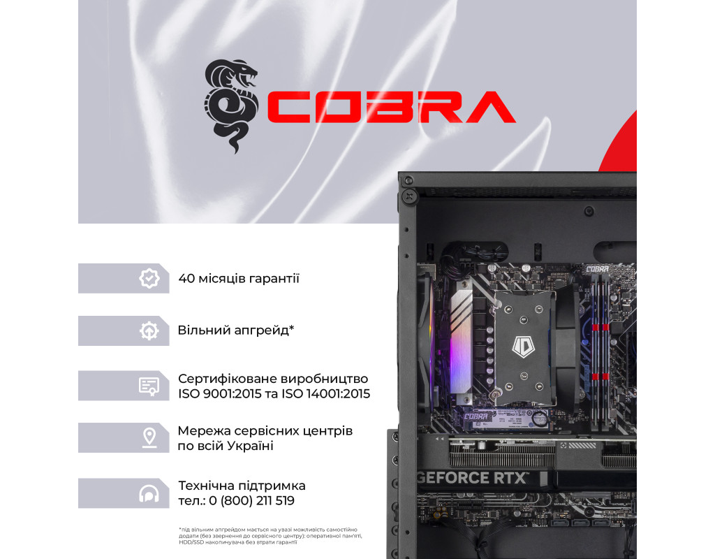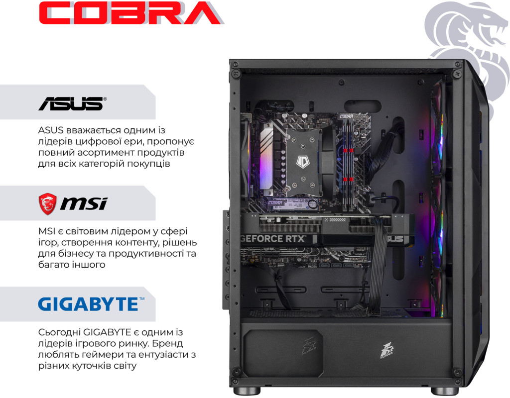 ПК COBRA збираються на базі комплектуючих визнаних світових лідерів, таких як Intel, AMD, MSI, ASUS, Zalman, ProLogix, Seagate, Toshiba, Hitachi, Transcend, Kingston і ін.