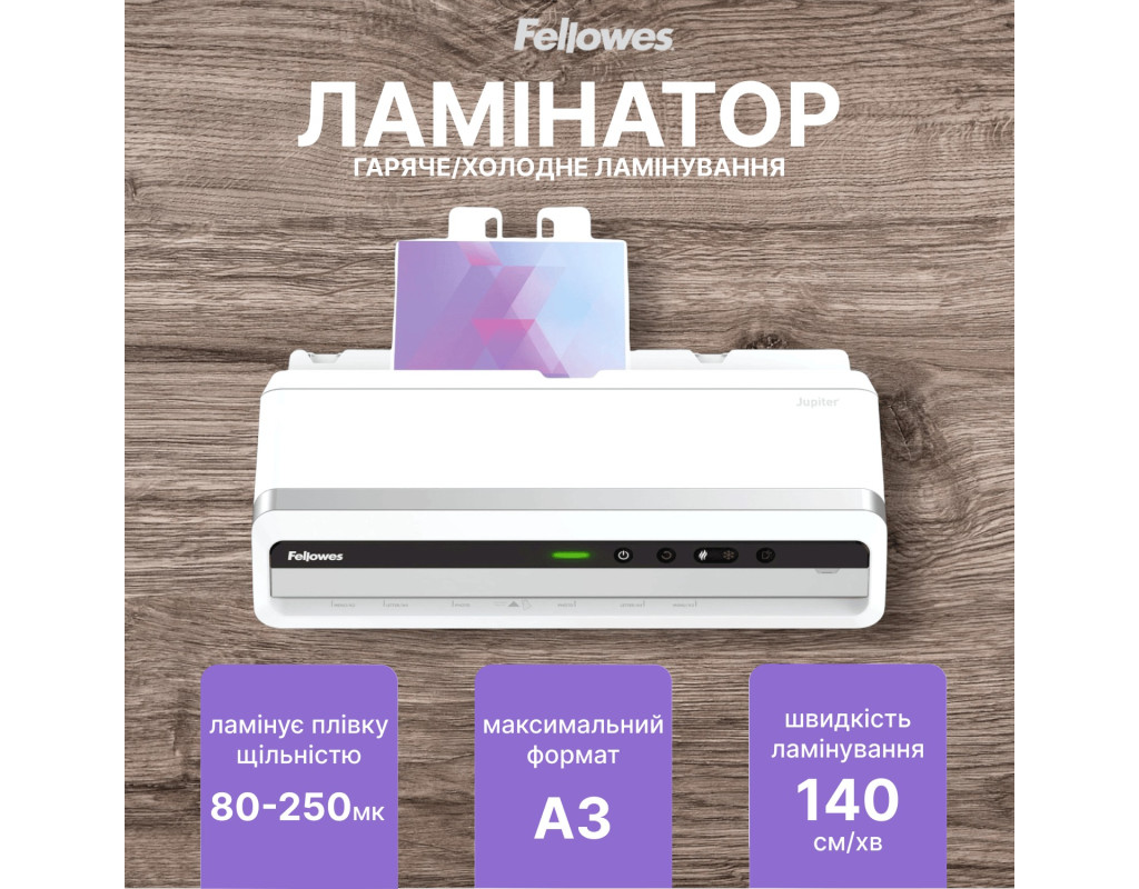 | Fellowes Jupiter A3 - професійний ламінатор для повсякденного використання в середньому офісі. Модель забезпечує високу швидкість, бездоганну якість ламінування та максимальну зручність завдяки інтелектуальним технологіям.