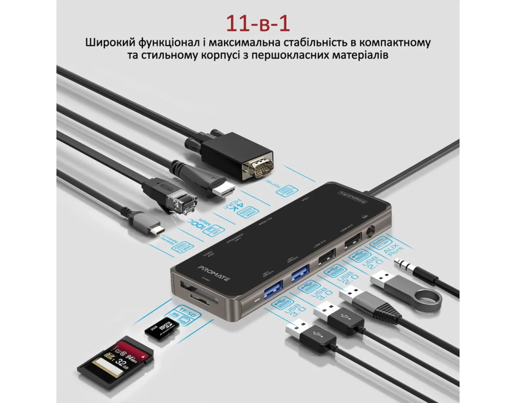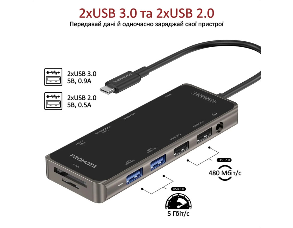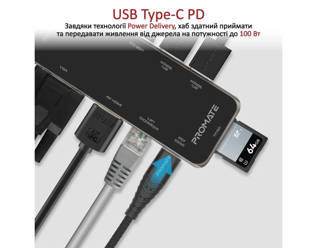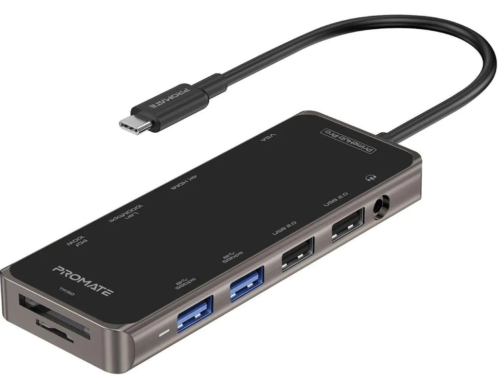 Type-C хаб PrimeHub-Pro — флагманська модель із лінійки 2021 року від Promate. Широкий функціонал і максимальна стабільність в портативному та стильному корпусі з першокласних матеріалів. Ґаджет об'єднав у собі все найкраще з хабів на сьогодні! Особливості: - USB Type-C PD: Завдяки технології Power Delivery, хаб може приймати й передавати живлення від джерела на потужності до 100 Вт.