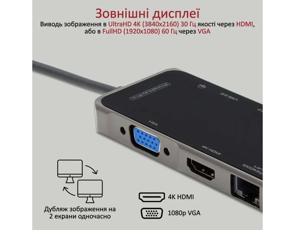- Зовнішні дисплеї: Виводь зображення в роздільній здатності UltraHD 4K (3840x2160) 30 Гц через HDMI або в FullHD (1920x1080) 60 Гц через VGA. Підтримує дублювання картинки одночасно на 2 екрани.