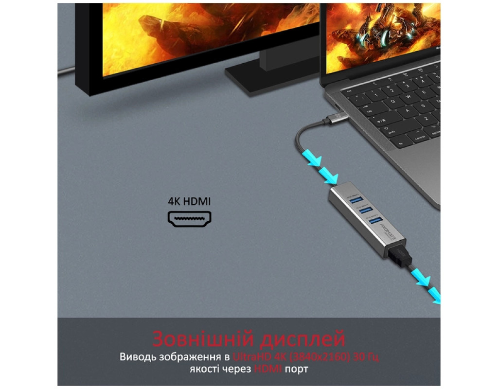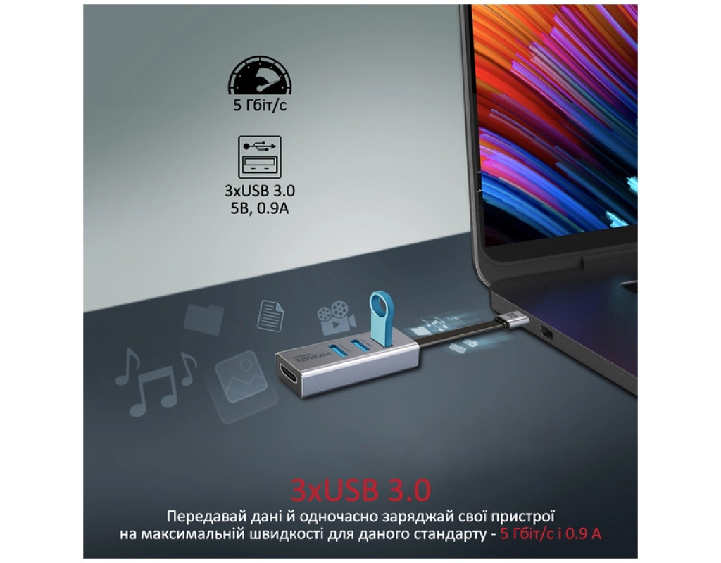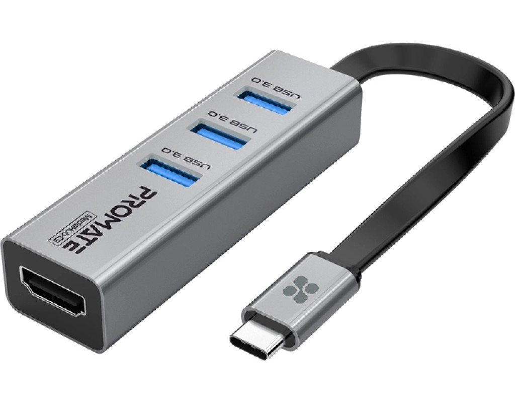 Транслюй медіадані, передавай файли та приєднуй периферійні пристрої за допомогою MediaHub-C3 — компактного та функціонального USB-C хаба від Promate. Особливості: - Зовнішній дисплей: виводь зображення в роздільній здатності UltraHD 4K (3840x2160) 30 Гц через HDMI порт.