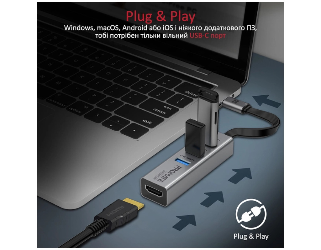 - Якісні матеріали: Надійний USB-С хаб з анодованого алюмінію не перегрівається й має великий запас міцності.