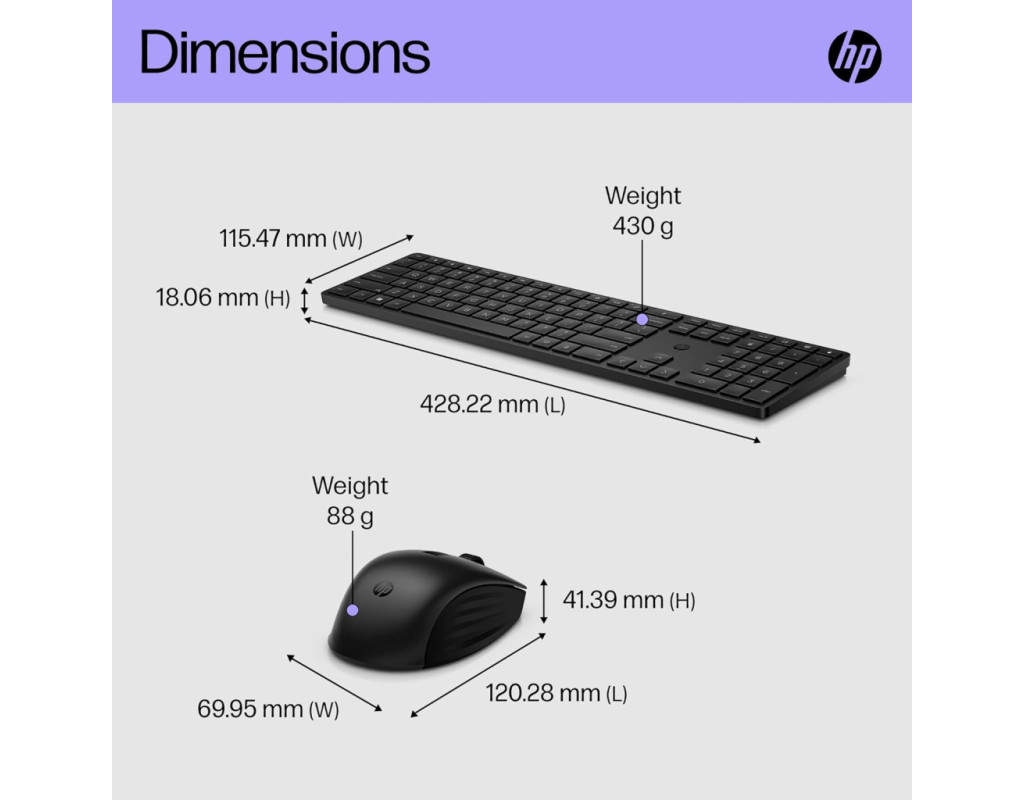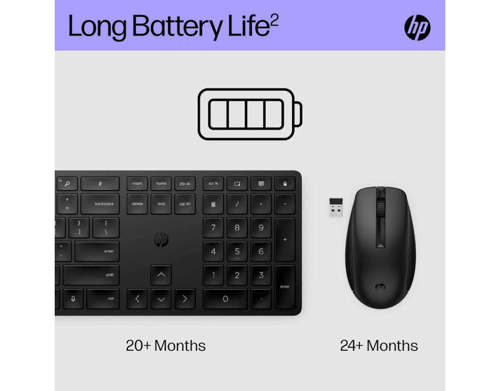 HP 650 Wireless — це стильний та ергономічний комплект клавіатури та миші, що забезпечує комфортну та ефективну роботу. Клавіатура з повнорозмірною тризонною розкладкою має низькопрофільні клавіші з ходом 2,0 мм, що забезпечують точне та приємне натискання. Миша з багатоповерхневою сенсорною технологією дозволяє працювати на різних поверхнях без втрати точності. Комплект HP 650 Wireless (4R013AA) поєднує в собі стильний дизайн, ергономіку та функціональність, забезпечуючи комфортну роботу як вдома, так і в офісі. Технології та функціональність Клавіатура має повнорозмірну тризонну розкладку з низькопрофільними клавішами, хід яких становить 2,0 мм, що забезпечує точне та приємне натискання. Завдяки бездротовому з'єднанню 2.4 ГГц через USB-приймач, ви отримуєте стабільне з'єднання з радіусом дії до 10 метрів. Миша оснащена багатоповерхневою сенсорною технологією, що дозволяє працювати на різних поверхнях без втрати точності. Вона має ергономічний дизайн, підходить для обох рук та забезпечує комфорт навіть при тривалому використанні. Дизайн та ергономіка Клавіатура має регульовані ніжки, що дозволяють змінювати кут нахилу до 6 градусів для оптимального комфорту. Клавіші мають контурну форму, що сприяє точному набору тексту. Миша має контурну форму та зручне захоплення, що забезпечує комфорт при щоденному використанні. Живлення та екологічність Клавіатура та миша працюють від двох батарейок AAA кожна, забезпечуючи до 20 місяців автономної роботи для клавіатури та до 24 місяців для миші. Виготовлені з понад 60% переробленого пластику, ці пристрої сприяють зменшенню відходів та підтримці екологічної відповідальності. Для кого? HP 650 Wireless ідеально підходить для користувачів, які цінують комфорт, функціональність та екологічність. Цей комплект стане чудовим вибором для дому, офісу або навчання. Особливості: