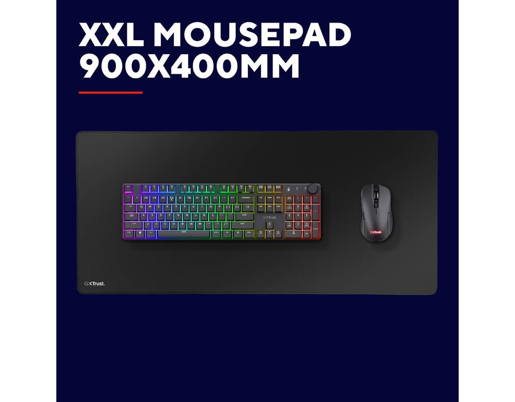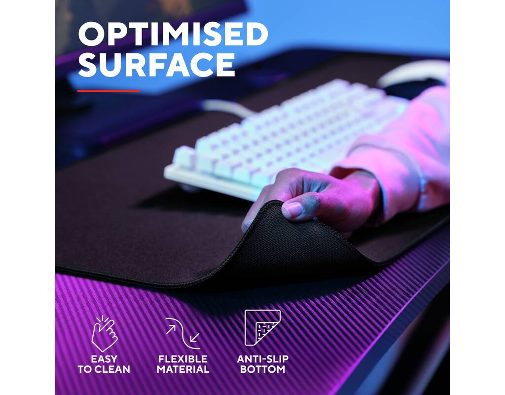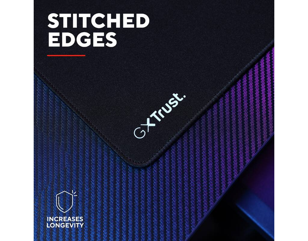 | Ігрова поверхня Trust GXT 759 XXL забезпечує комфортну та точну гру. Завдяки розміру 900x400 мм вона вміщує клавіатуру та мишу, а гумова основа запобігає ковзанню. Оптимізована текстура гарантує точність рухів, а прошиті краї захищають від зношування. |