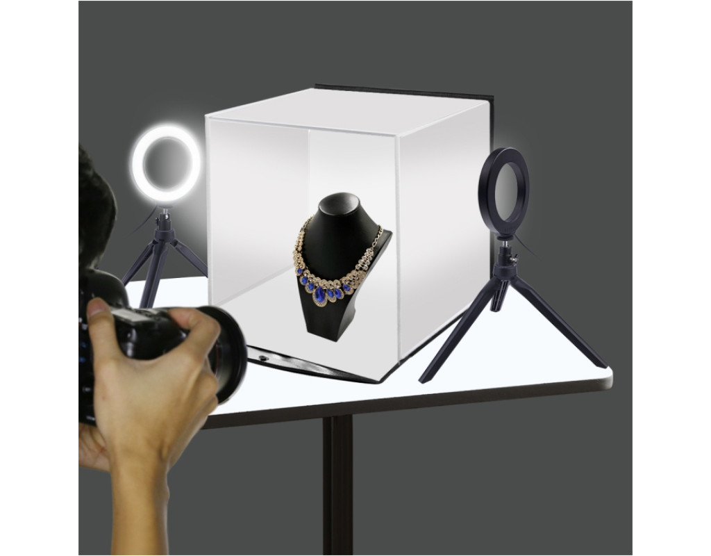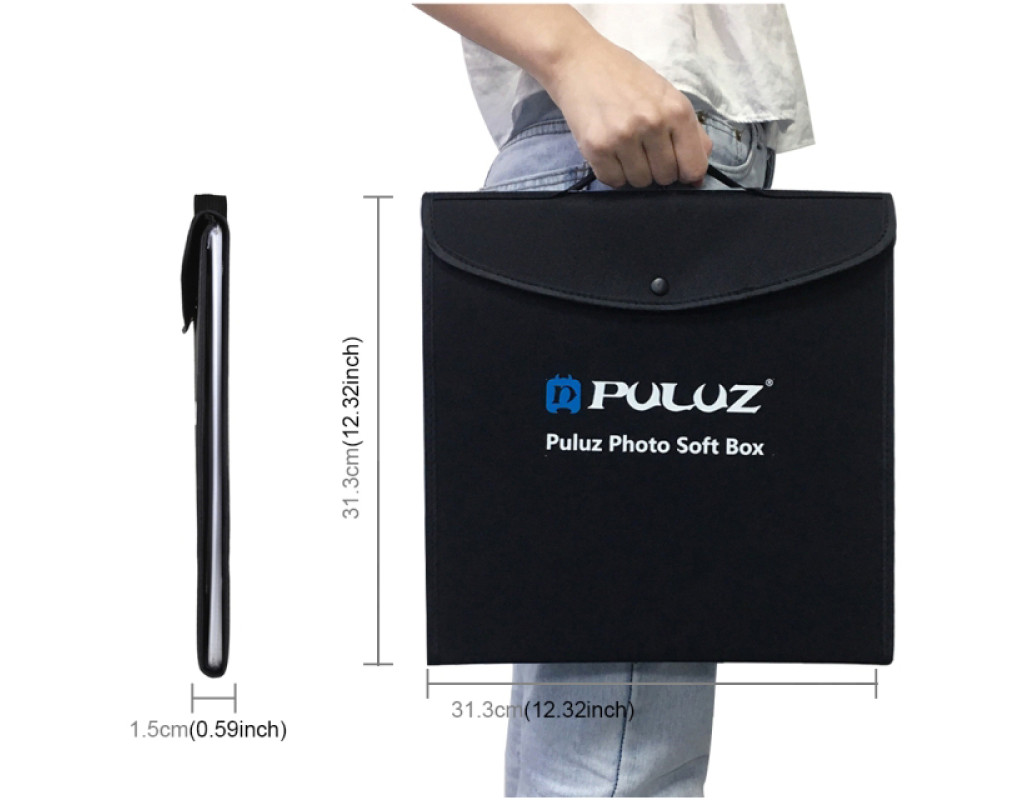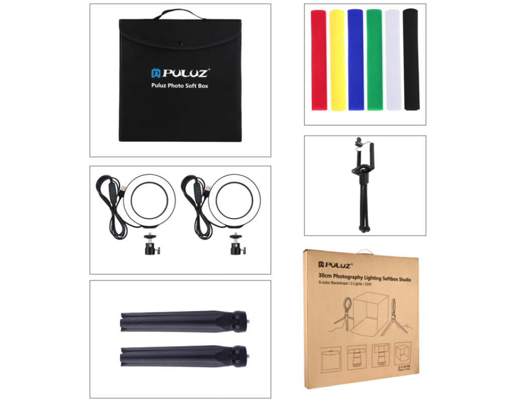 Puluz PU5130 (30x30x30см) це компактний комплект для предметної чи макро фотографії чи відео оглядів. Дана модель є чудовим рішенням для фотозйомки та відеозйомки продуктів, які призначені для інтернет магазинів і комерційних каталогів. Виріб легкий в експлуатації та оперативний в установці. Крім того, виріб у комплект поставки включає спеціально спроектовану сумку для комфортного транспортування. Тент виготовлений з білого міцного нейлону, прозора тканина розсіює світло від джерела для мінімізації тіней, завдяки спеціальним липучкам можливе досить швидке з'єднання бічних стінок. Також є бічні кишеньки для зберігання аксесуарів. Як освітлення передбачені два кільцеві освітлювачі потужністю 4-8W кожен. У комплекті йде 6 фонів: білий, чорний, синій, червоний, зелений, жовтий. Фона виконані із якісного матеріалу. Для зберігання та транспортування в комплекті йде якісний чохол чорного кольору. Особливості: