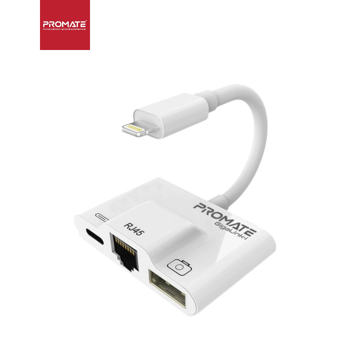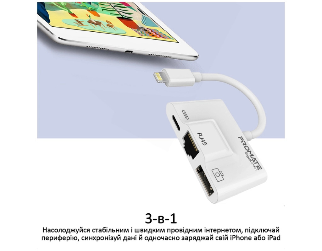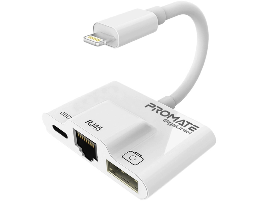 Насолоджуйся стабільним та швидким дротовим інтернетом, підключай периферійні пристрої, синхронізуй дані та одночасно заряджай свій iPhone або iPad c Promate GigaLink-i. Особливості: - USB 3.0 OTG порт: Передавай та синхронізуй дані на швидкості 480 Мбіт/с.
