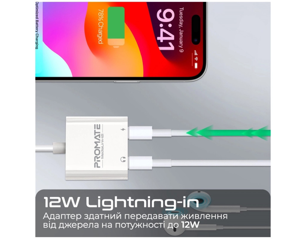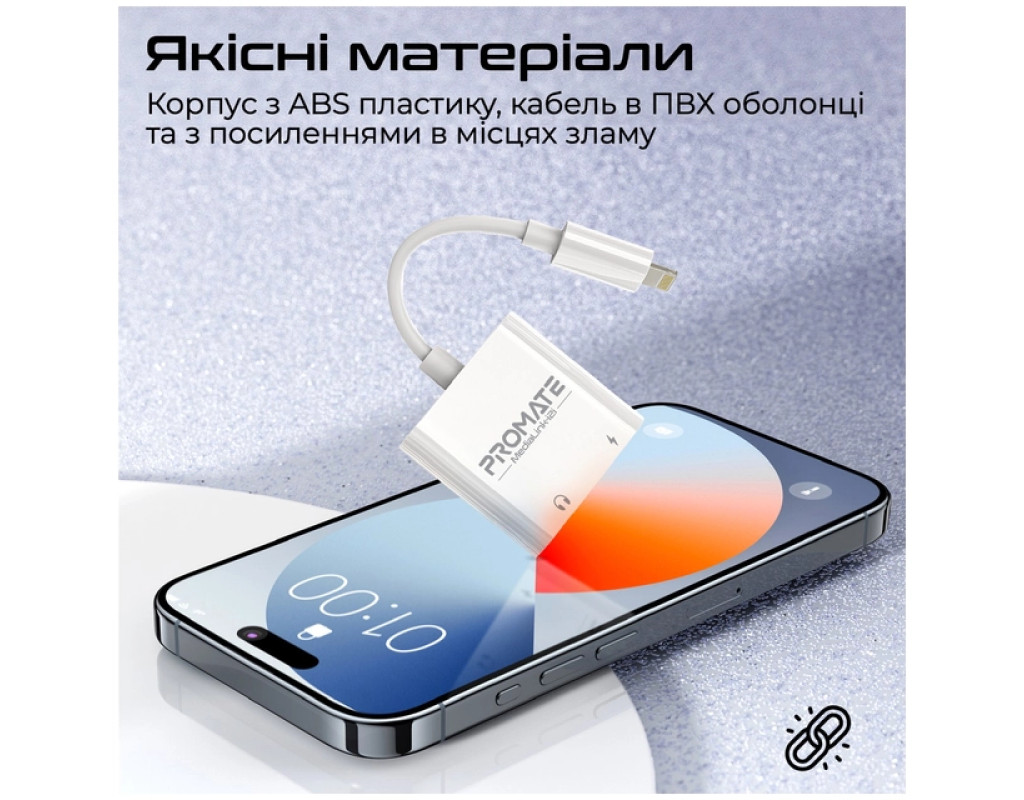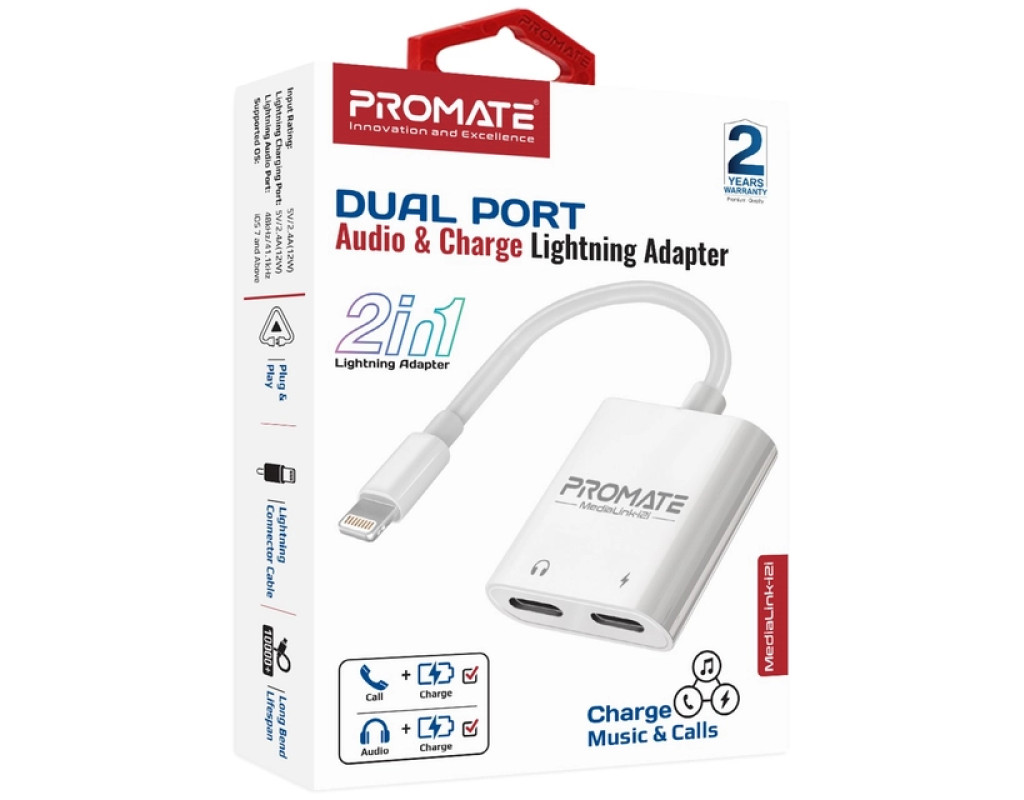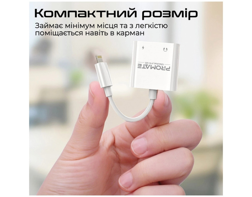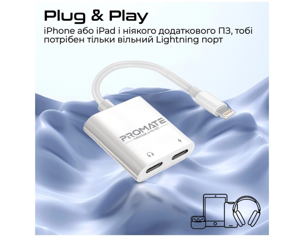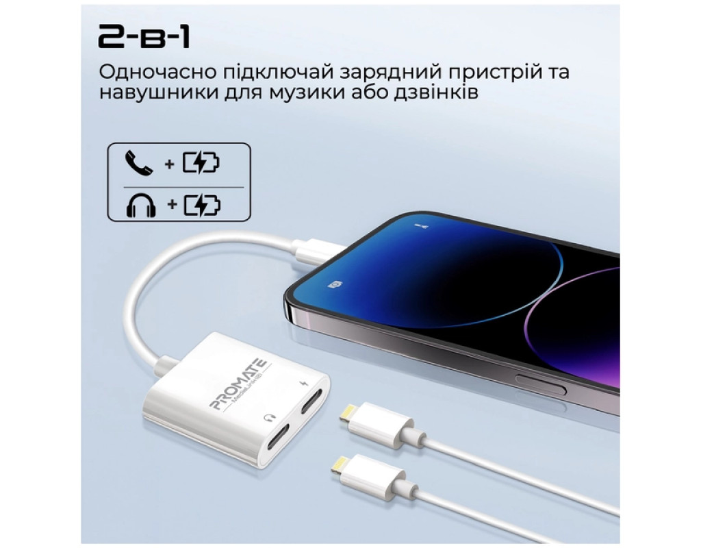 Прослуховуй музику та одночасно заряджай свій iPhone або iPad з Promate MediaLink-i2і. Особливості: - 2-в-1: Одночасно підключай зарядний пристрій та навушники для музики або дзвінків. Зручність та функціональність в одному пристрої.