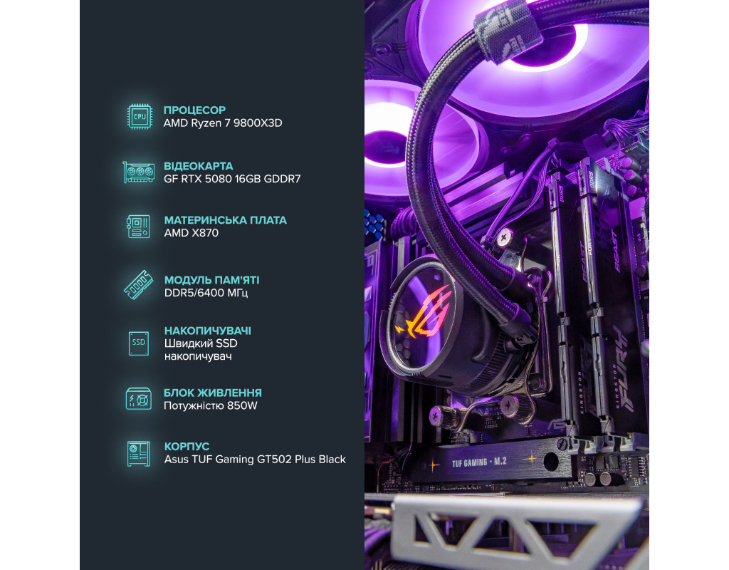 Персональний комп`ютер ASGARD (A98X3D.32.S20.58.6024); AMD Ryzen 7 9800X3D (4.7 - 5.2 ГГц) / ОЗП 32 ГБ / SSD 2 ТБ / NVIDIA GeForce RTX 5080 16 ГБ / без ОП / LAN / Wi-Fi / Bluetooth / Ubuntu / чорний