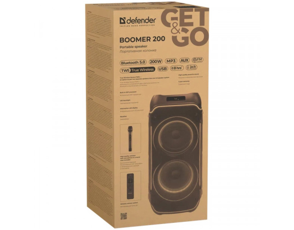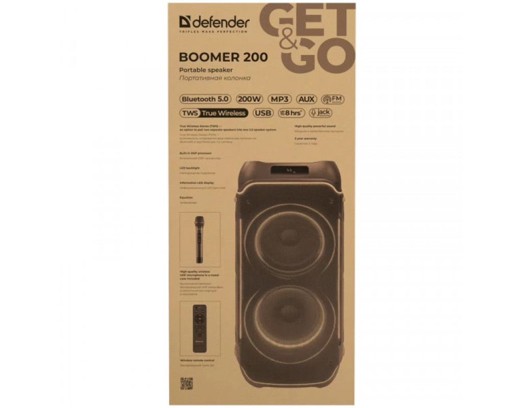Defender Boomer 200 також оснащена вбудованим FM-приймачем, що дозволяє слухати ваші улюблені радіопрограми, та функцією True Wireless Stereo (TWS), яка сприяє сполученню двох окремих колонок у єдину акустичну систему 2.0, створюючи об'ємний стереозвук. Підтримка USB-накопичувачів і MicroSD-карт надає змогу відтворювати музику без комп'ютера, що ідеально підходить для вечірок та заходів на відкритому повітрі.