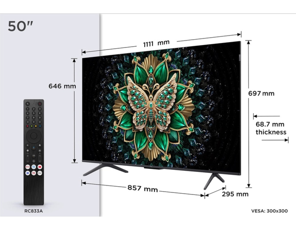 | Телевізор TCL 50C6K — ваш портал у світ ультрасучасних технологій і захоплюючих візуальних переживань. Цей телевізор з *діагоналлю екрана* 50 дюймів об'єднує новітні розробки у галузі відтворення зображень, забезпечуючи неймовірну чіткість та яскравість завдяки *роздільній здатності* 3840 x 2160 пікселів. Технологія MiniLED створює зображення з вражаючим *контрастом* та максимально точною передачею кольорів. Один з головних елементів цього телевізора — технологія *QD-Mini LED*, яка об'єднує переваги QLED і OLED, даруючи вам глибші *кольори* та вищу *пікову яскравість*. OLED-подібна точність підсвічування та більш тривалий термін служби роблять його ідеальним вибором для тривалих сесій перегляду. Технології *HDR* (HDR10, HDR10+, Dolby Vision, HLG) дозволяють насолоджуватися вражаючими деталями у найтемніших та найбільш освітлених сценах. Процесор AiPQ Pro - серце цього телевізора - реалізує *інтелектуальні алгоритми* для максимальної оптимізації якості зображення. З ним ви отримаєте неймовірну *чіткість*, яка перевершить ваші найсміливіші очікування. Завдяки 120 Гц частоті розгортки і підтримці сучасних ігрових функцій, цей телевізор стане ідеальним партнером для *геймерів*, які прагнуть високої швидкості реакції в іграх. Виняткове *звучання* забезпечують динаміки потужністю 2 x 15 Вт, а також підтримка *Dolby Atmos*, що створює ефект повного занурення в аудіовізуальний контент. Телевізор також може похвалитися інтеграцією з *Google TV*, яка відкриває величезний світ контенту та керування голосом завдяки *Google Assistant*. Ви можете легко передавати вміст із своїх пристроїв завдяки підтримці *Wi-Fi, Bluetooth*, та *інтерфейсів HDMI та USB*, створюючи зручне середовище для розваг. Дизайн телевізора втілює концепцію *мінімалізму*: безрамковий, ультратонкий металевий корпус створює елегантний вигляд, який прикрасить будь-який інтер'єр. Монтаж за стандартом VESA (300x300 мм) дозволяє розмістити пристрій оптимально у вашій кімнаті. Цей телевізор — більше ніж просто пристрій для перегляду відео — це ваш квиток у світ безмежних можливостей, де кожна деталь продумана для того, щоб забезпечити вам ні з чим не порівнюване задоволення від перегляду. З TCL 50C6K, ви зможете випробувати якість, яка стане вашим новим стандартом. |