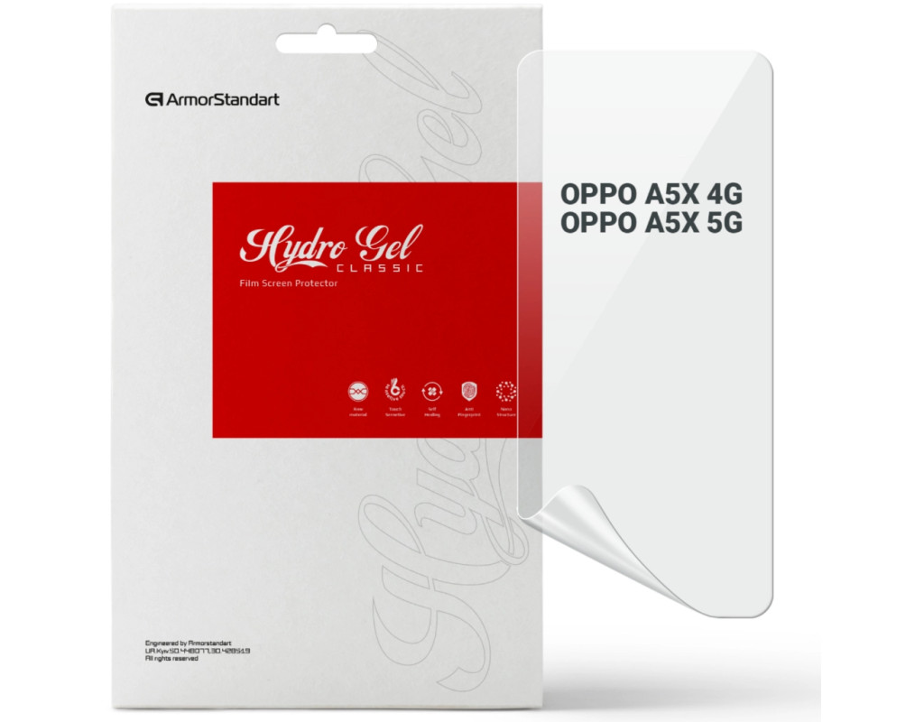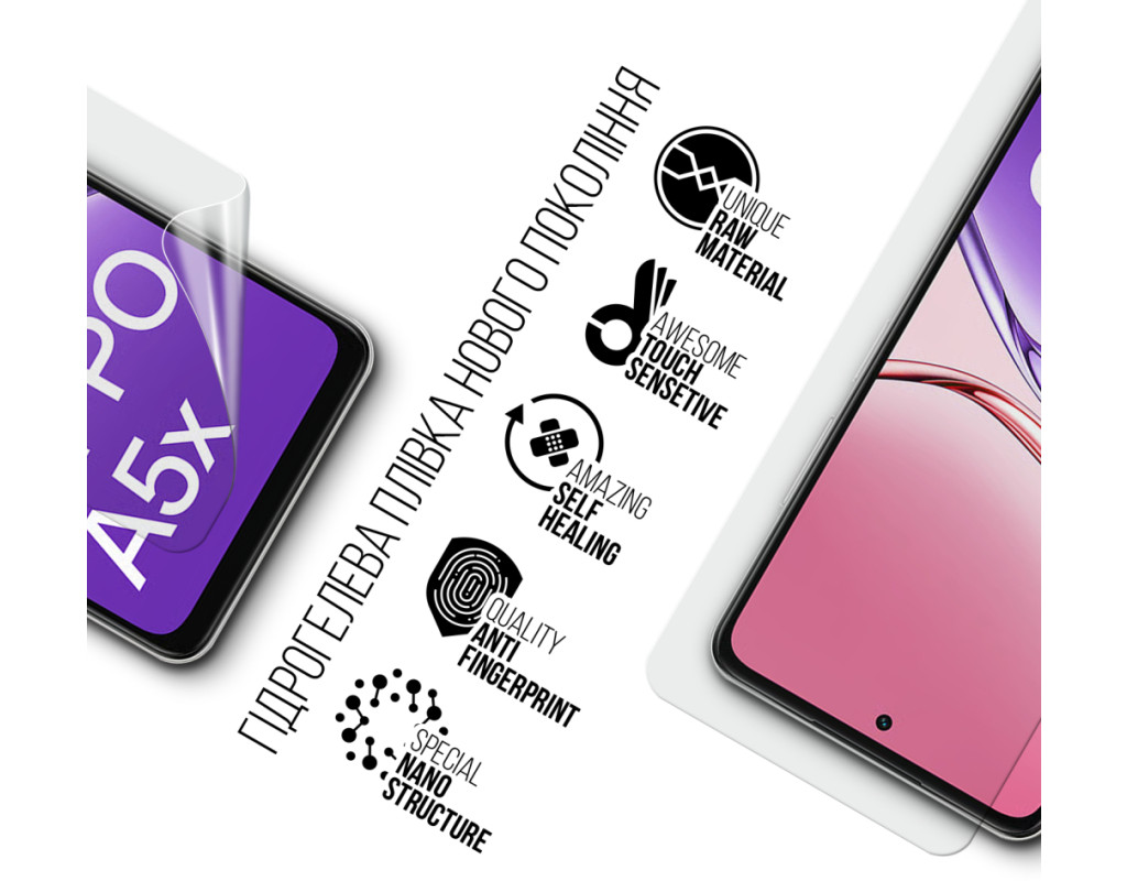 Призначення - для телефону, Вид покриття - глянсове, гідрогелева, Сумісність з моделями - OPPO A5X, Підходить для телефонів з діагоналлю - 6.67", Кількість в упаковці - 1 шт