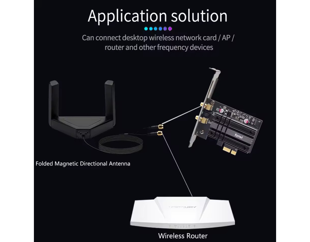 Підтримує дводіапазонний Wi-Fi з частотами 2.4 ГГц і 5 ГГц, забезпечуючи стабільне підключення до інтернету. Антена сумісна з маршрутизаторами AX210, що робить її чудовим варіантом для покращення бездротової мережі. |