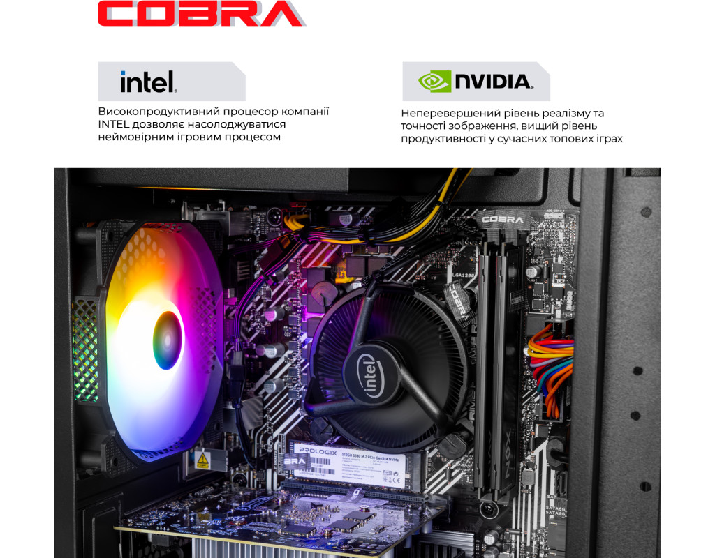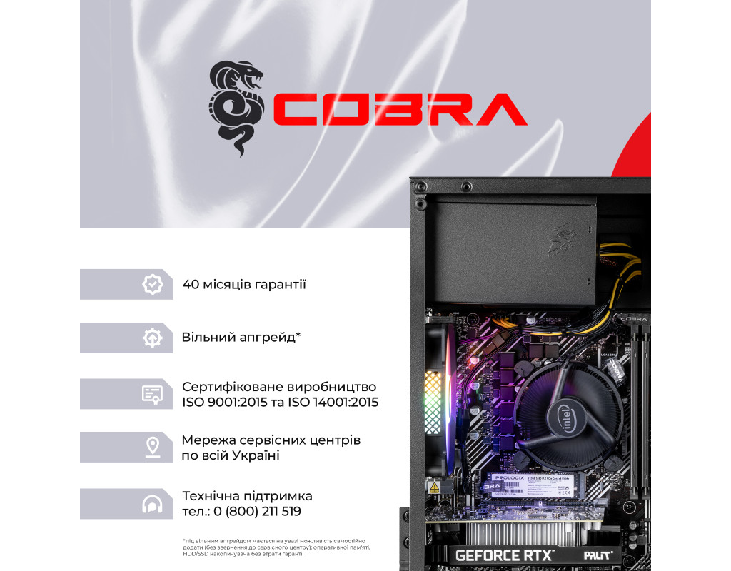 ПК COBRA збираються на базі комплектуючих визнаних світових лідерів, таких як Intel, AMD, ASUS, MSI, Gigabyte, і ін.