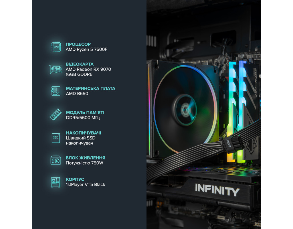 Персональний комп`ютер ASGARD Eitr (A75F.32.S20.97.16.6200); AMD Ryzen 5 7500F (3.7 - 5.0 ГГц) / ОЗП 32 ГБ / SSD 2 ТБ / AMD Radeon RX 9070 16 ГБ / без ОП / LAN / Wi-Fi / Bluetooth / Linux / чорний