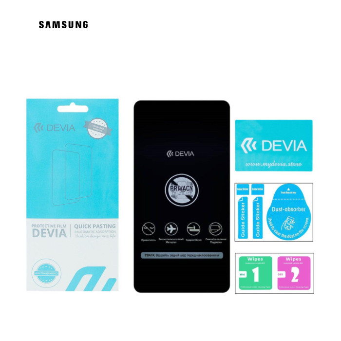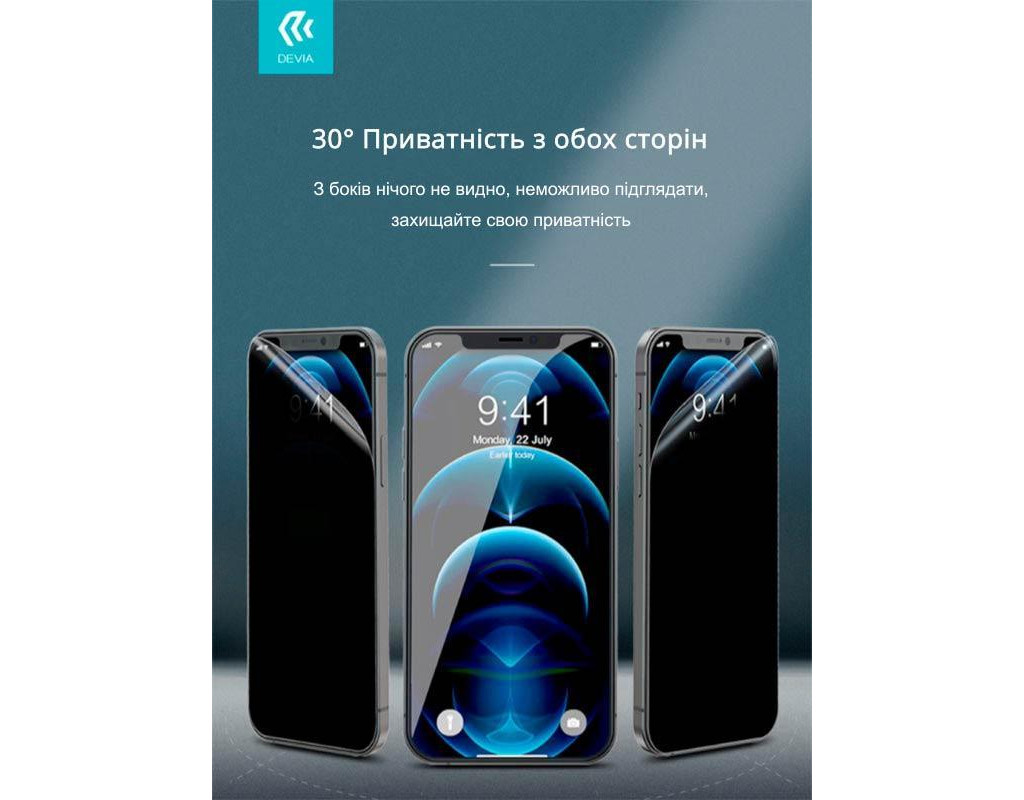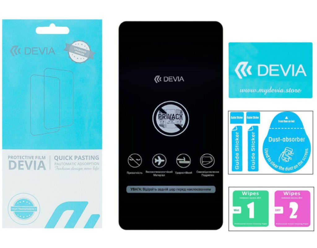 | матова Гідрогелева плівка Devia Privacy захистить ваш смартфон від пошкоджень, не тріскається при падінні та не сколюється по краях. Завдяки функції антишпигуна, ви можете приховати інформацію на вашому телефоні від інших людей. особливості: Функція Анти-шпигун – зображення на екрані не видно, якщо дивитися на нього під кутом. Олеофобне покриття ефективно зменшує відбитки пальців. Плівка самовідновлюється після незначних ушкоджень. Преміальна якість матеріалів, 3 шари виключно якісної плівки. Комплектація: Захисна плівка Стикер для очищення Волога серветка Мокра серветка Картка |