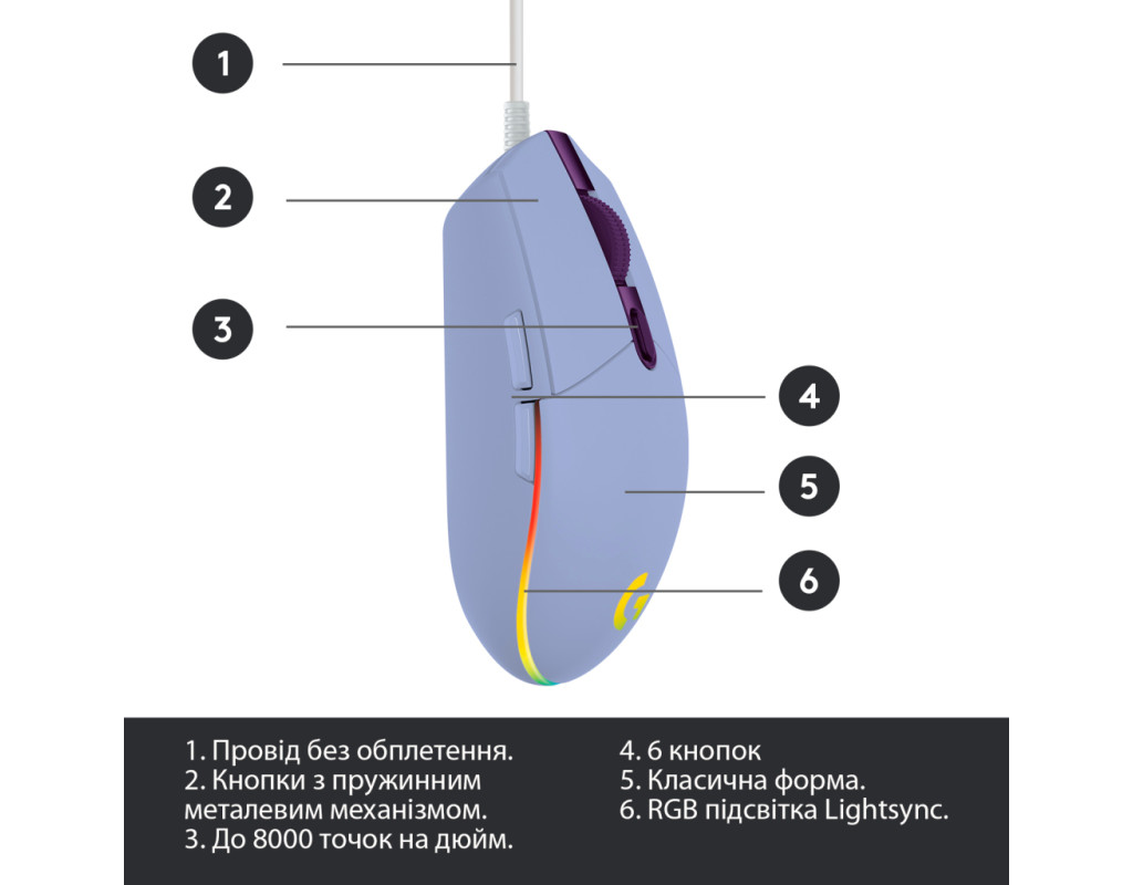 | Мишка Logitech G102 Lightsync Lilac (910-005854) є відмінним вибором для геймерів, які цінують якість, функціональність та стиль. Цей пристрій, призначений для використання з комп'ютером, відзначається своєю оптичною точністю та дарує максимум задоволення від гри завдяки своїм численним інноваційним функціям та дизайнерським рішенням. Однією з основних переваг є RGB-підсвічування за технологією LIGHTSYNC. Вона не лише надає можливість обирати з палітри у 16,8 млн відтінків, але й дозволяє налаштовувати кольорові схеми, що синхронізуються з вашими іграми, мультимедійним контентом чи навіть музикою. Ви можете створити свої власні кольорові комбінації або ж використовувати готові анімації — вибір за вами! Ігровий датчик високого класу забезпечує неперевершену точність та чутливість переміщення. Ви можете налаштувати роздільну здатність від 200 до 8000 dpi, що дозволить задавати ідеальні умови для кожної гри чи задачі. Завдяки програмі Logitech G HUB, ви можете створити до п'яти попередніх налаштувань чутливості, роблячи управління максимально точним та зручним. Максимальна функціональність миші доповнюється класичною 6-кнопковою конструкцією, яка включає п'ять програмованих кнопок. Це дозволяє вам призначати внутрішньоігрові команди та спрощувати процес контролю, адаптуючи мишку під ваші власні потреби. Спеціальний механізм натискання з ексклюзивним металевим пружинним механізмом від Logitech G забезпечує надзвичайну точність та стабільність натискання на праві та ліві кнопки. Це особливо важливо під час інтенсивної гри, коли кожний ваш рух має значення. Мишка також володіє відмінною сумісністю з операційними системами. Використання програмного забезпечення Logitech G HUB дозволяє без зусиль налаштувати персональні параметри підсвічування, чутливості та команд кнопок, що робить цей пристрій справжнім партнером у будь-якому віртуальному світі. Цей гаджет не лише функціональний, але й стильний завдяки своєму фіолетовому кольору, який додає яскравості будь-якому робочому простору. З довжиною кабелю 2.1 м і вагою всього 85 г, мишка забезпечує максимальний комфорт при тривалих ігрових сесіях. Її компактні розміри (116 х 62 х 38 мм) дозволяють зручно розмістити її на робочій поверхні, не займаючи багато місця. Переконайтеся в якості та перевагах мишки Logitech G102 Lightsync Lilac, яка стане вашим вірним помічником у віртуальних пригодах. Ідеально підходить для таких ігор, як World of Tanks, ця мишка забезпечує максимальне занурення в ігровий процес і бездоганну керованість у кожному кліку. |