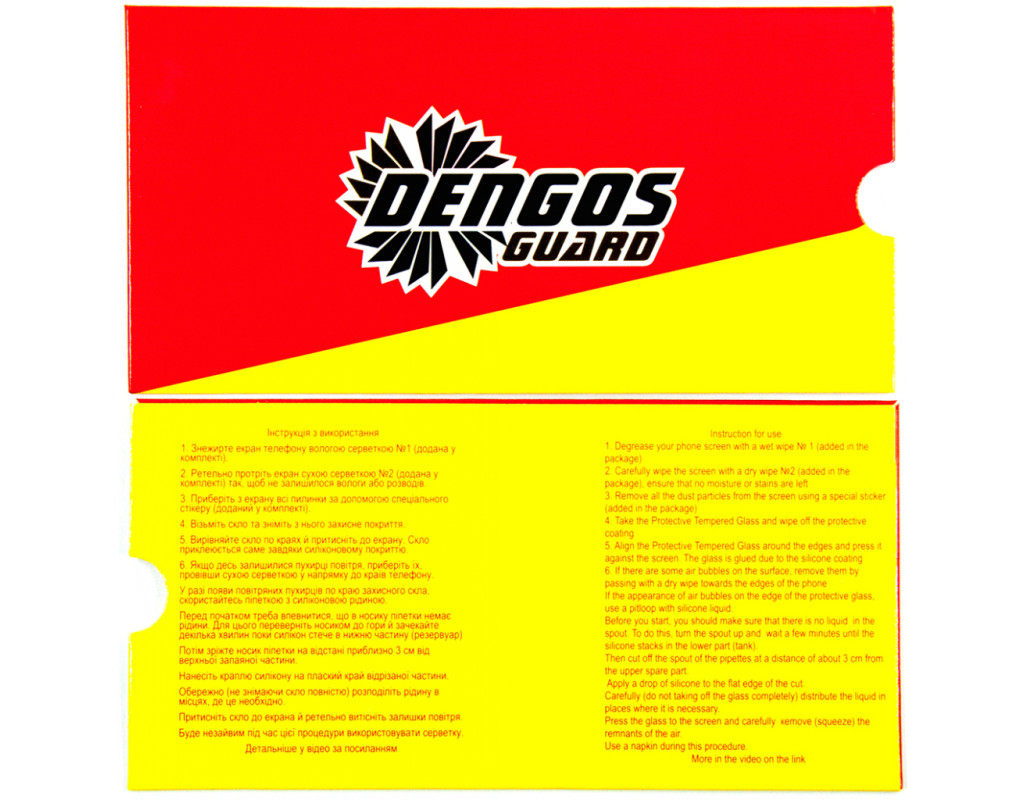 У комплекті: захисне скло DENGOS Full Glue, 2 серветки для оброблення екрана (волога та суха), стикер для збирання пилу, піпетка із силіконовою оливою. Інструкція із застосування: 1. Знежирте екран телефона вологою серветкою №1 (є в комплекті). За певний час експлуатації захисного скла на телефоні, під його краями можуть з'явитися повітряні бульбашки. В цьому разі ви можете скористатися силіконовим мастилом. Захисне скло DENGOS Full Glue Tempered Glass — це якісний, практичний у використанні аксесуар, який допоможе уникнути дорогої процедури заміни екрана смартфона, збереже дисплею його первісний зовнішній вигляд. |