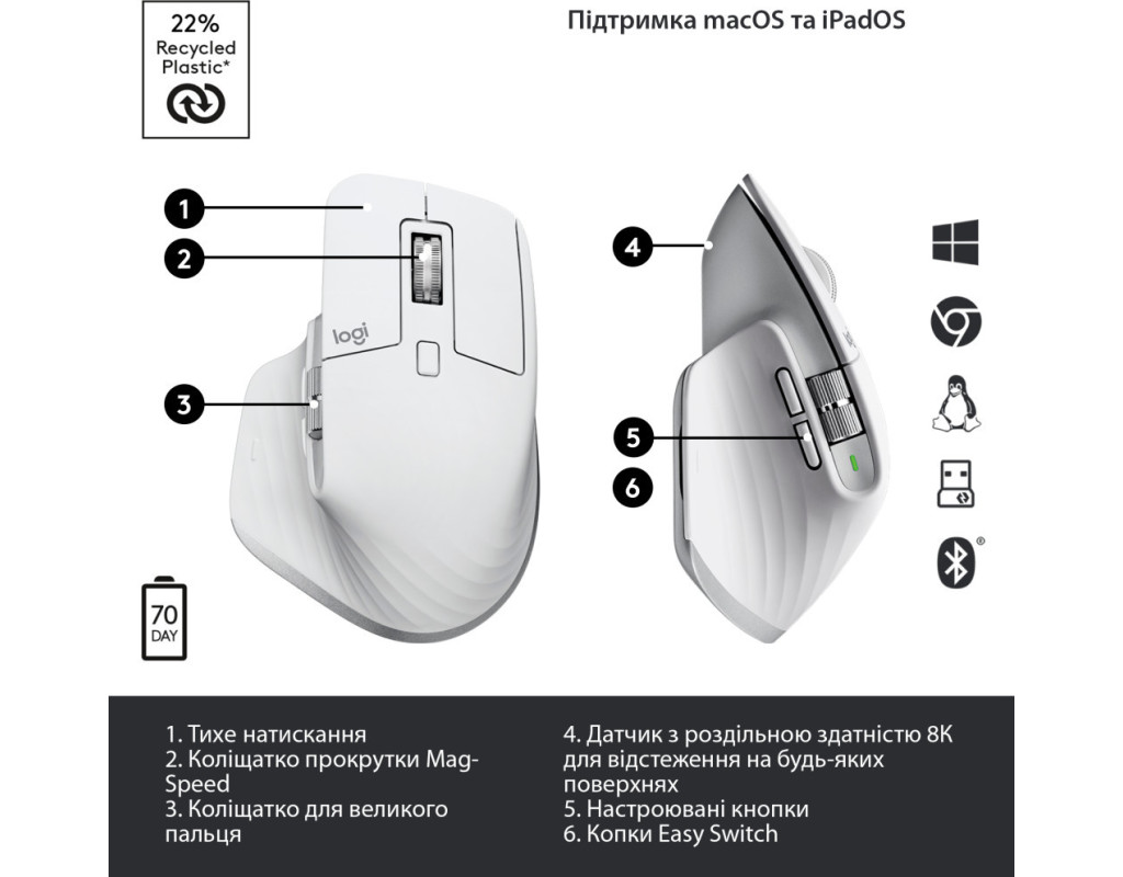 | Мишка Logitech MX Master 3S Performance Wireless Mouse Bluetooth Pale Grey (910-006560) поєднує в собі передові технології та естетичний дизайн, створені спеціально для тих, хто цінує якість і унікальні функції. Це не просто аксесуар, а інструмент для підвищення вашої продуктивності без жодних компромісів. Однією з головних переваг MX Master 3S є її бездротове підключення через Bluetooth або USB адаптер 2.4 ГГц. Цей підхід надає вам повну свободу пересування та позбавляє від зайвих кабелів на робочому столі. Універсальний класичний дизайн у стильному сірому кольорі впишеться в будь-який інтер'єр, доповнюючи його елегантністю. Інноваційна технологія Quiet Clicks забезпечує тиху роботу мишки, що є незамінним для тих, хто цінує спокійну атмосферу під час роботи. Новітня система прокрутки MagSpeed дозволяє буквально відчути швидкість – коліщатко обертається зі швидкістю до 1000 рядків за секунду, що дає неперевершену точність, а це важливо як для звичайної роботи, так і для серйозних проектів. MX Master 3S оснащена оптичним датчиком з неймовірною чутливістю до 8000 DPI, що дозволяє їй працювати навіть на незвичних поверхнях, таких як скло. Кожен користувач може індивідуально налаштувати функціонал за допомогою Logi Options+, програмуючи 7 кнопок під свої задачі. Ергономічний дизайн мишки враховує всі анатомічні особливості руки, що запобігає втомі навіть при тривалому використанні. Текстурована поверхня не тільки приємна на дотик, але й сприяє втомі – це істотна перевага для довгих робочих сесій чи активного геймінгу. <б>Тривала автономність забезпечується вбудованим акумулятором, який тримає заряд до 70 днів. А якщо потрібна швидка зарядка, то всього хвилина підключення через USB-C кабель дозволить користуватися мишкою ще до трьох годин. Кожна деталь розроблена для вашого комфорту. Обираючи Logitech MX Master 3S, ви отримуєте не просто мишку, а партнера, який забезпечить комфортну роботу та високу продуктивність кожного дня. |