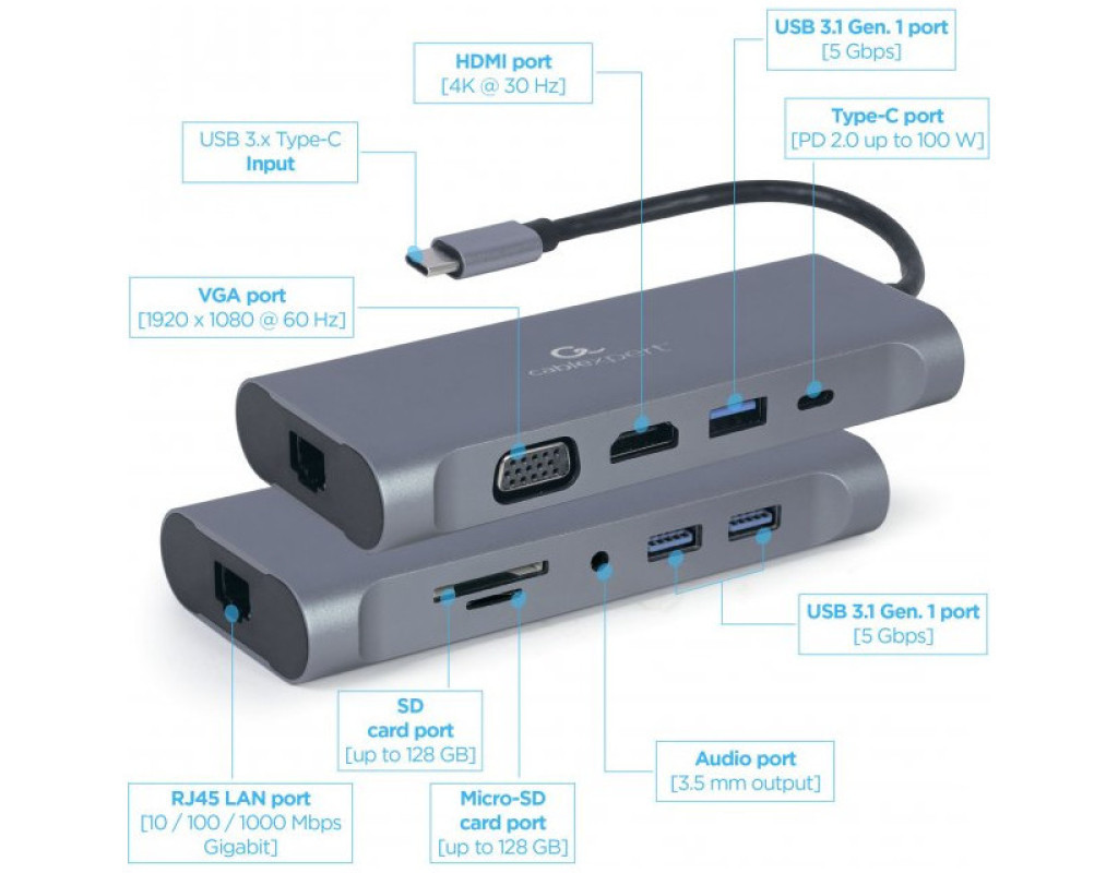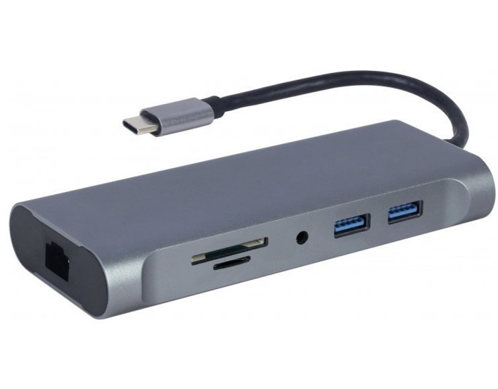 Тип - зовнішній, Інтерфейс підключення - USB Type-C, Вихідні роз'єми - 1 х RJ45, 1 x HDMI, VGA, 3 х USB 3.0, microSD, Також шукають - для MacBook