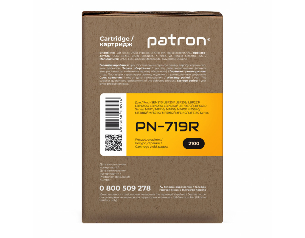 | Тонерний картридж PATRON для CANON 719 Extra (PN-719R) (CT-CAN-719-PN-R) для використання в монохромних лазерних друкуючих пристроях. Є найвигіднішим рішенням для користувачів, які багато друкують. Виготовлений з використанням корпусу оригінального картриджа. Рекомендований для багаторазового перезаправлення завдяки міцному корпусу і новим комплектуючим, які забезпечують довгострокову екстра-економію. До кожної коробки картриджа вкладено тестовий відбиток. Сумісність з друкуючими пристроями LBP-6300DN / LBP-6650DN / i-SENSYS MF5840dn / i-SENSYS MF5940dn. Сумісність картриджа PATRON для CANON 719 Extra (PN-719R) (CT-CAN-719-PN-R) з тонером HP LaserJet P2015/2035 / HP LaserJet P2015/2035 / HP LaserJet Pro 400 M401 / HP LaserJet Pro 400 M401 / HP Universal №3 / HP Universal №3 / HP Universal №3 / HP Universal №3 / HP Universal №3 / HP LaserJet P2015/2035. Якість друку і ресурс тестуються за міжнародним стандартом STMC. |