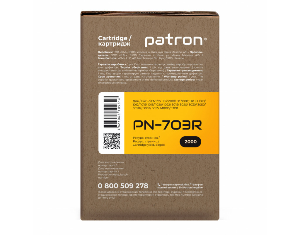 | Картридж PATRON CANON 703 Extra (PN-703R) (CT-CAN-703-PN-R) strong> Витрата залежить від того, наскільки сторінка заповнена. На стандартній сторінці тексту площа під чорнилом складає 5%. Це стандартна характеристика заповнення тонером поверхні паперу, і норми витрати тонера (ресурс картриджа) наводяться саме по ній. Сумісні моделі з PATRON CANON 703 Extra (PN-703R) (CT-CAN-703-PN-R): strong> i-SENSYS LBP2900, i-SENSYS LBP2900B, i-SENSYS LBP3000, Laser Shot LBP2900, Laser Shot LBP3000 |