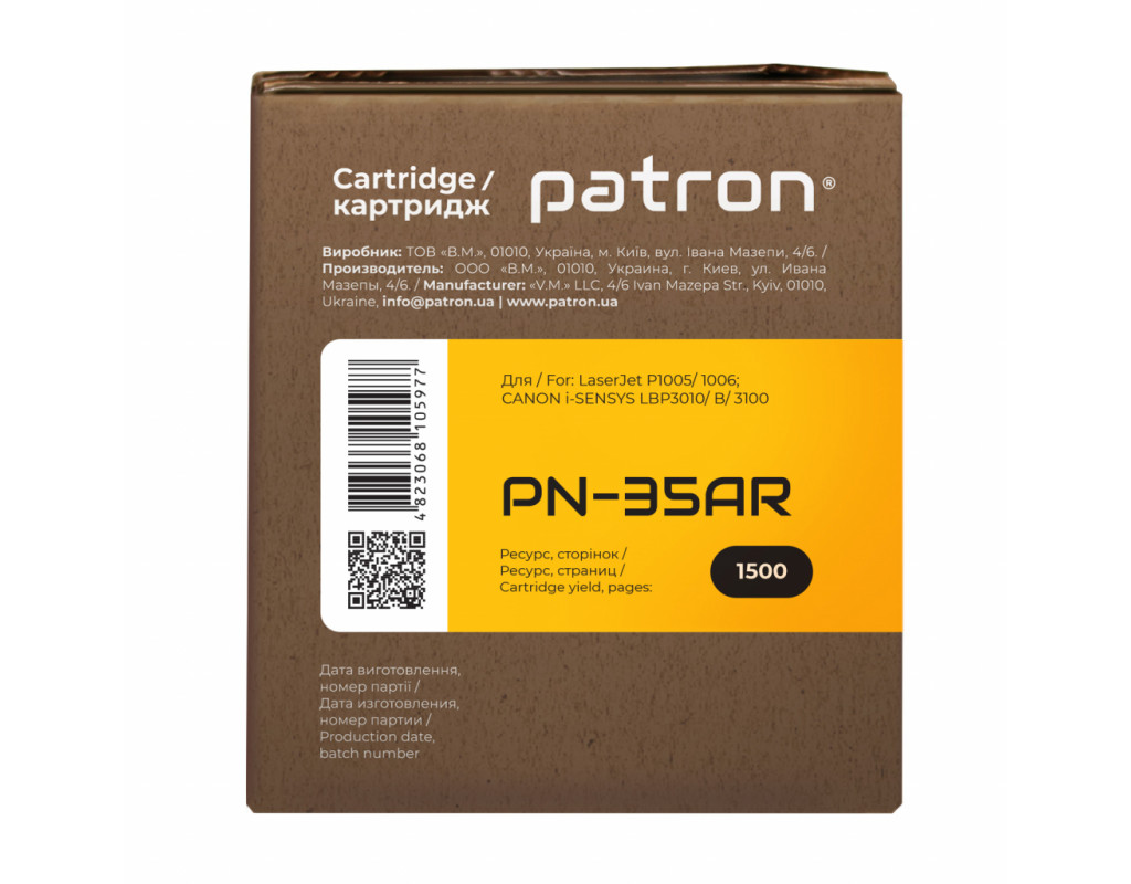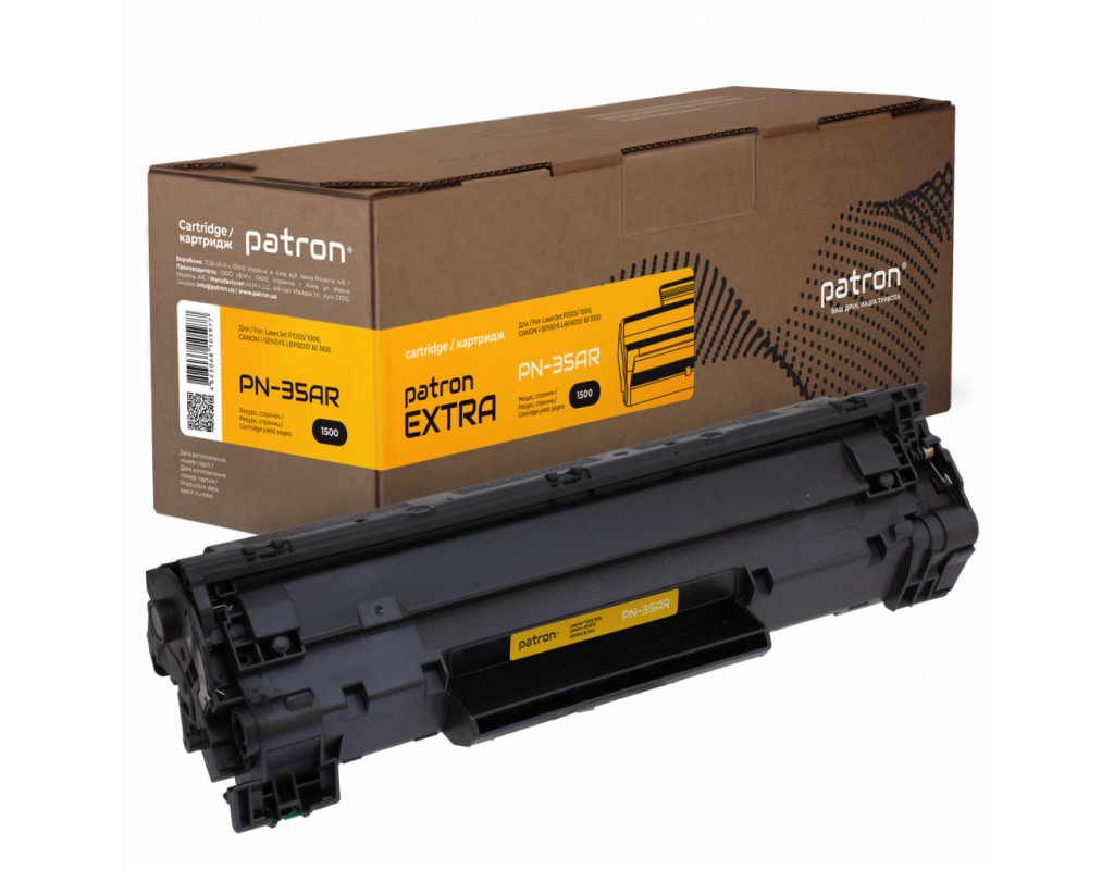 | Картридж PATRON для HP LJP1005/1006 Extra (CT-HP-CB435A-PN-R). Витрата залежить від того, наскільки сторінка заповнена. На стандартній сторінці тексту площа під чорнилом складає 5%. Це стандартна характеристика заповнення тонером поверхні паперу, і норми витрати тонера (ресурс картріджа) приводяться саме по ній. Сумісні моделі з PATRON для HP LJP1005/1006 Extra (CT-HP-CB435A-PN-R): HP LJP1005/1006 /CANON LBP3010 |