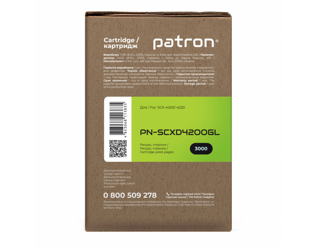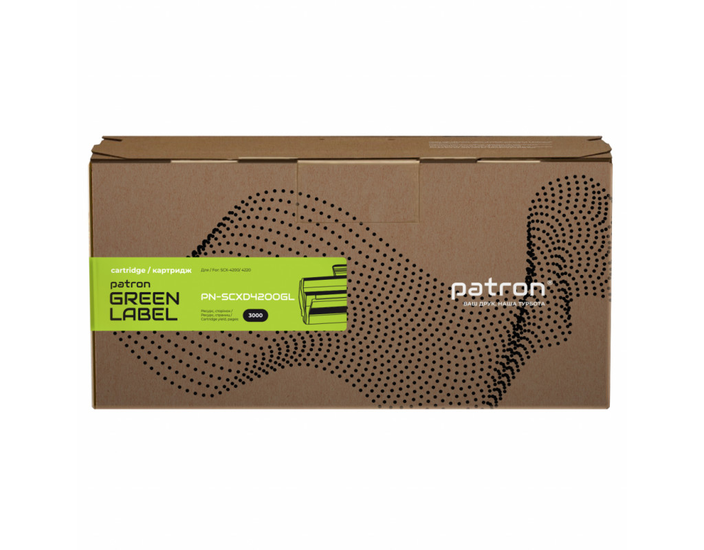 PATRON SAMSUNG SCX-4200/4220 GREEN Label чудово підійде для використання як в офісних, так і домашніх пристроях. Він має ресурс друку - 3000 стор при 5%-ному заповненні аркуша формату А4. Для виготовлення даного картриджа використовуються якісні перевірені комплектуючі. Готові картриджі перед продажем проходять більш високу ступінь контролю серед картриджів своєї категорії, що є гарантією надійності. Можливість заправки. Якість друку і ресурс тестуються за міжнародним стандартом STMC.