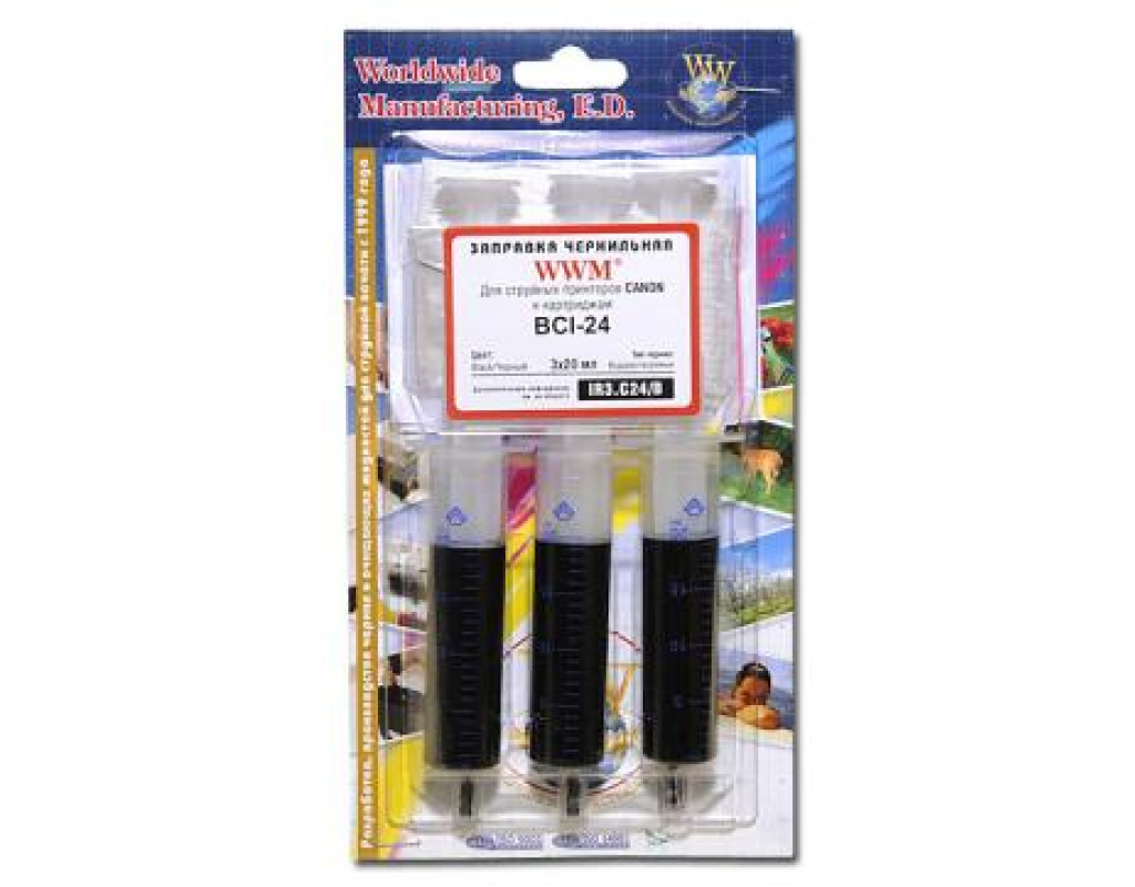 | Заправний набір WWM Canon BCI-24 (3x20мл) Black (IR3.C24 / B) Заправний набір від компанії WWM для струменевих принтерів Canon і картриджів BCI-24, призначений для самостійної заправки, і може без особливих труднощів бути використаний як в офісі, так і в квартирі. До складу цього набору входить три ємності для заправки, з 20 мл водорозчинного чорнила чорного кольору в кожній. |