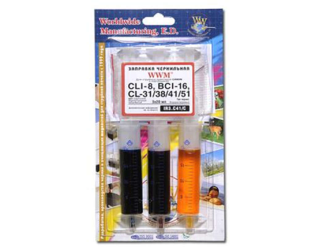 | Заправний набір WWM Canon CL-41 / CL-51 (3 x 20мл) C / M / Y (IR3.C41 / C) Заправний набір від компанії WWM для струменевих принтерів Canon, призначений для самостійної заправки картриджів, і може без особливих труднощів бути використаний як в офісі, так і в квартирі. До складу набору входить три ємності по 20 мл, для заправки водорозчинним чорнилом кольору Cyan, Magenta і Yellow. Сумісність з картриджами: Canon Canon 0617B025 / Canon 0618B001 / Canon 0621B024 / Canon 0622B024 / Canon 0623B024 / Canon 2146B005 / Canon 38 / Canon 41 / Canon 51 / Canon 8 Cyan / Canon 8 Magenta / Canon 8 Yellow / Canon CL-38 / Canon CL-41 / Canon CL-51 / Canon CLI-8 C. |