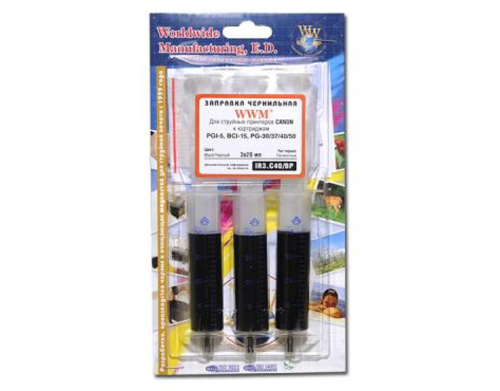 Заправний набір WWM Canon PG-40 / PG-37 (3 x 20 мл) Black Pigmented (IR3.C40 / BP) Заправний комплект для CANON PG-40. Заправний набір WWM Canon PG-40 / PG-37 (3 x 20 мл) Black Pigmented (IR3.C40 / BP) для струменевих принтерів Canon, призначений для самостійної заправки картриджів, і може без особливих складнощів бути використаний як в офісі, так і в квартирі. До складу WWM Canon PG-40 / PG-37 входить три ємності для заправки, з 20 мл пігментного чорнила чорного кольору. |