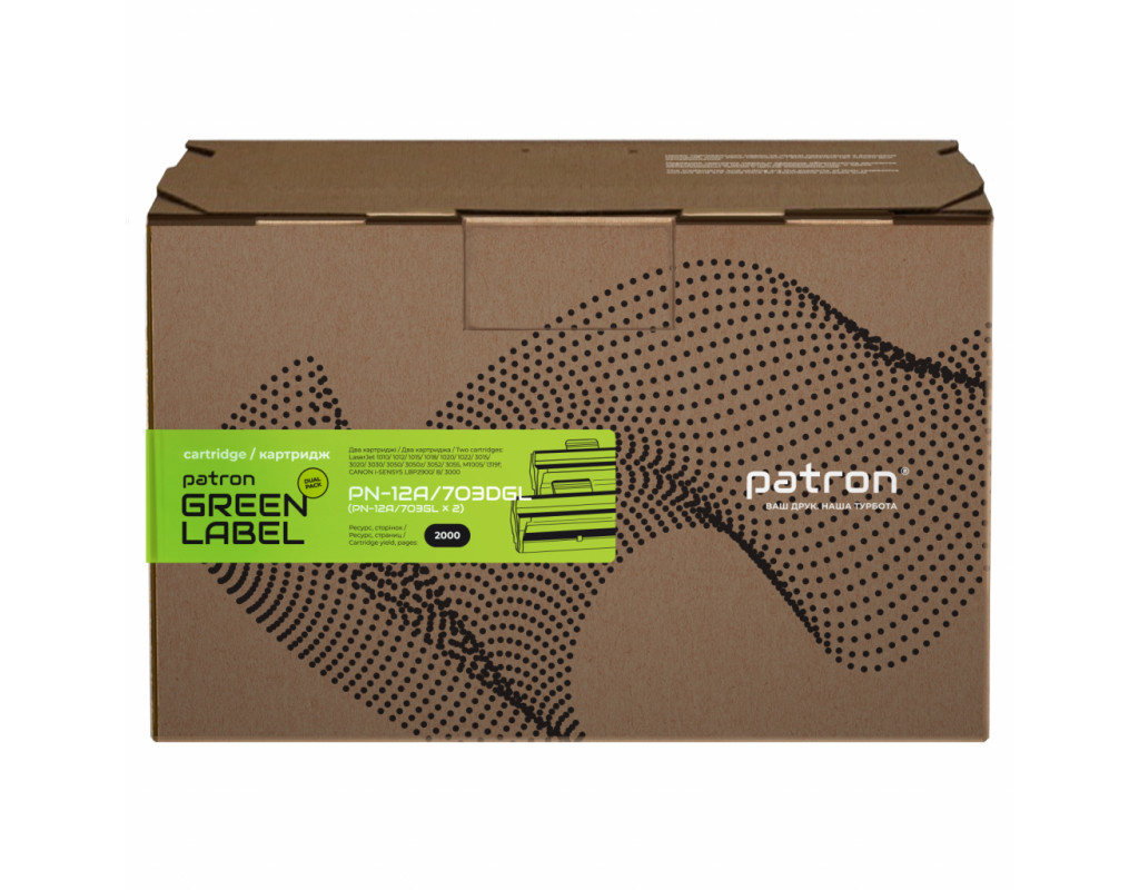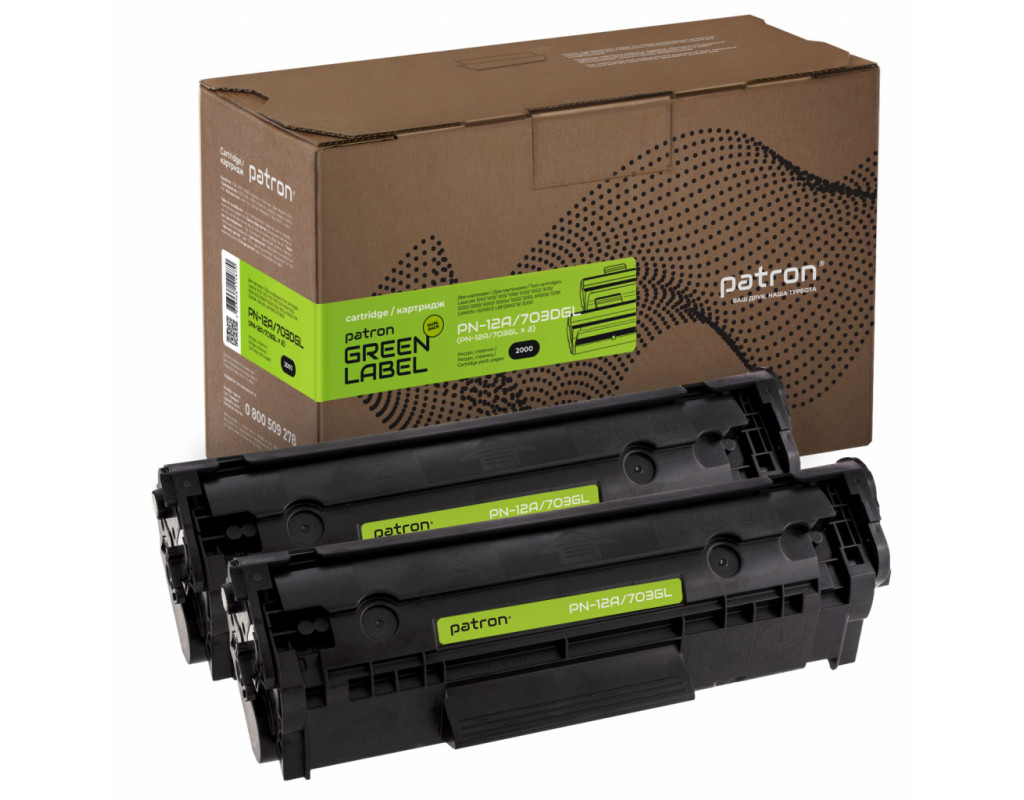 Картридж PATRON HP LJ Q2612A/CANON 703 GREEN Label (DUAL PACK) (PN-D101DGL) - призначений для використання в лазерних принтерах та БФП. Дана серія картриджів – це нове економічне рішення для користувачів, які прагнуть оптимізувати витрати на друк, не втрачаючи в якості відбитків і надійності продукту.