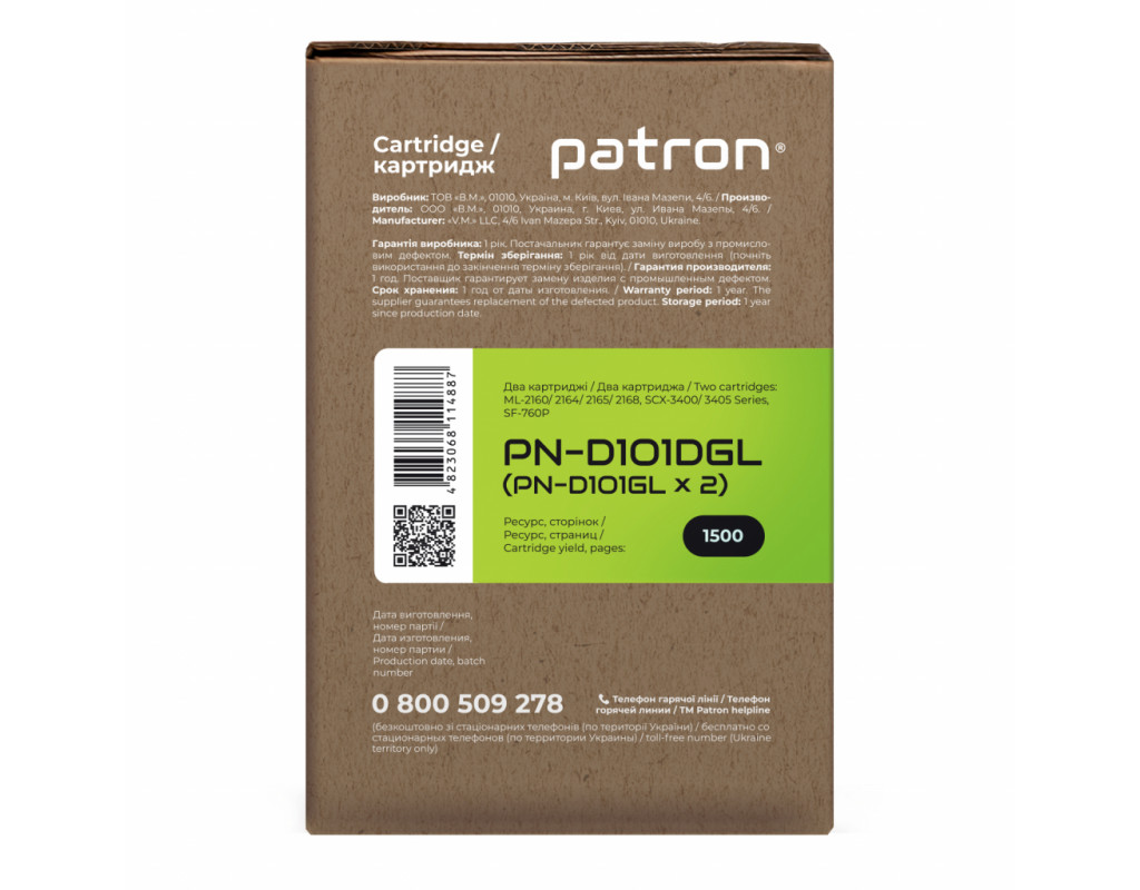 Картридж PATRON SAMSUNG MLT-D101S (ML-2160) GREEN Label (DUAL PACK) (PN-D111DGL) - призначений для використання в лазерних принтерах та БФП. Дана серія картриджів – це нове економічне рішення для користувачів, які прагнуть оптимізувати витрати на друк, не втрачаючи в якості відбитків і надійності продукту.
