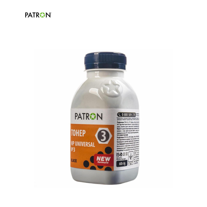 Тонер HP LJ Universal №3 60 г PATRON (PN-HU3-060) з максимальною сумісністю за доступною ціною. : Особливості: Має більш широку сумісність і є більш універсальним продуктом в порівнянні з попереднім поколінням універсального тонера. Рекомендований для застосування в більш ніж 40 моделях картриджів, більш ніж в 60 моделях лазерних принтерів і МФУ. Покращені показники оптичної щільності відбитків в порівнянні з попереднім поколінням. Стабільні показники оптичної щільності протягом усього ресурсу картриджа. Покращені показники оптичної щільності фону, тонер, більш стійкий до факторів впливає на даний показник. Покращені показники ефективності перенесення тонера, внаслідок чого менше тонера йде в відпрацювання. Сировина з якого виробляється новий тонер має екологічний сертифікат Nordic Ecolabel. Рекомендований для друку великих обсягів стандартної документації. |