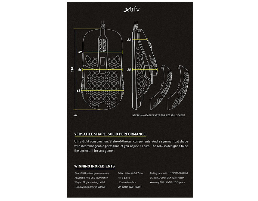 | Представляємо геймерську мишку Xtrfy M42 RGB Miami Blue (XG-M42-RGB-BLUE), яка поєднує в собі найсучасніші технології та стильний дизайн. Цей незамінний аксесуар для будь-якого геймера вражає своєю надлегкою конструкцією, адже його вага всього лише 59 грамів. Це дозволяє досягти максимальної швидкості та точності під час ігрових сесій, мінімізуючи втомлюваність кисті навіть при тривалому використанні. Мишка має змінні симетричні частини, що дозволяє налаштувати її під свої індивідуальні потреби та комфорт. Цей аспект робить M42 особливо привабливою для геймерів з різними стилями гри. Завдяки вбудованому оптичному датчику з роздільною здатністю до 16000 dpi, забезпечується надзвичайна точність рухів, що важливо для досягнення перемог у захопливих віртуальних боях. Підключення мишки здійснюється через USB-інтерфейс, а 1.8-метровий дротовий кабель гарантує свободу рухів і стабільність зв’язку без жодних затримок. Окрім того, M42 обладнана тефлоновими ніжками, які забезпечують відмінне ковзання по будь-якій поверхні, збільшуючи швидкість реакцій у динамічних моментах гри. Не лише функціональність, але й зовнішній вигляд мишки продуманий до дрібниць. Її блакитний колір та RGB підсвітка додають яскравості робочому столу, створюючи неповторну атмосферу під час ігор або роботи. Ви можете налаштувати підсвітку відповідно до свого стилю, додавши відчути власну індивідуальність. M42 від Xtrfy – це не просто мишка, а ваш ключ до незабутнього ігрового досвіду. З таким знаряддям кожен геймер почуватиметься у впевненості та контролі, незалежно від жанру гри. Обирайте M42 RGB Miami Blue і насолоджуйтесь іграми на новому рівні якості та комфорту. |